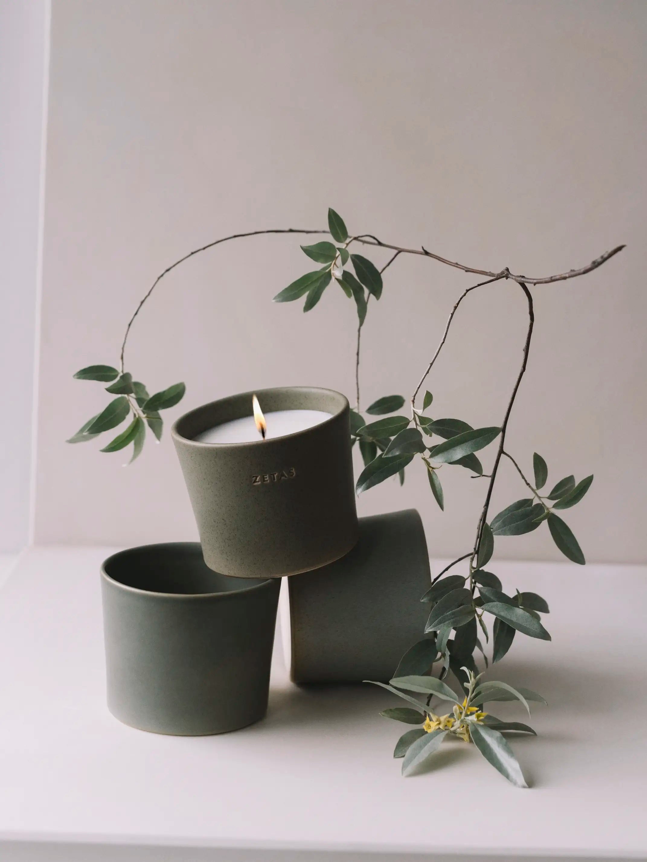 100% naturligt sojavax i en handgjord behållare tillverkad av stengodslera, producerad lokalt i Sverige av Porslinsfabriken i Lidköping