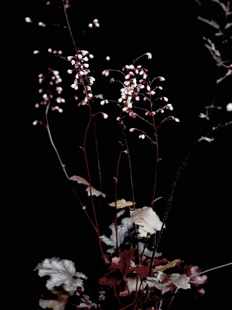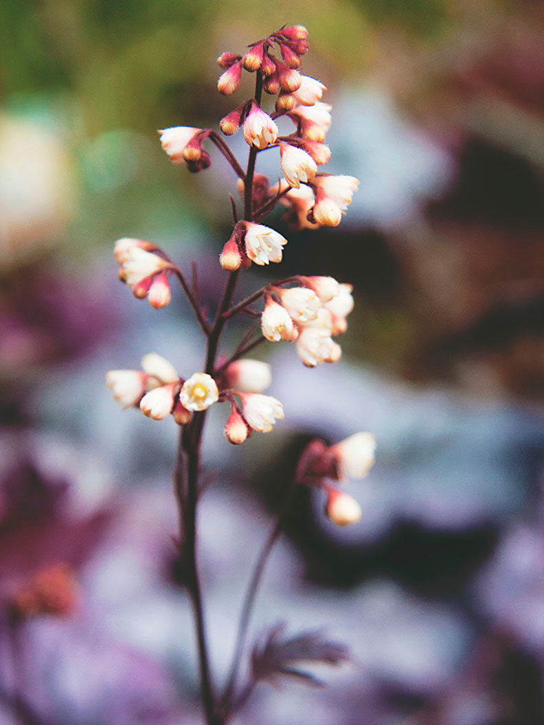 Alunrot 'Black Pearl' - Heuchera blommar med vita små klocklika blommor på tunna stänglar. Den har svarta blanka blad med en rosaviolett undersida och lite vågiga kanter.