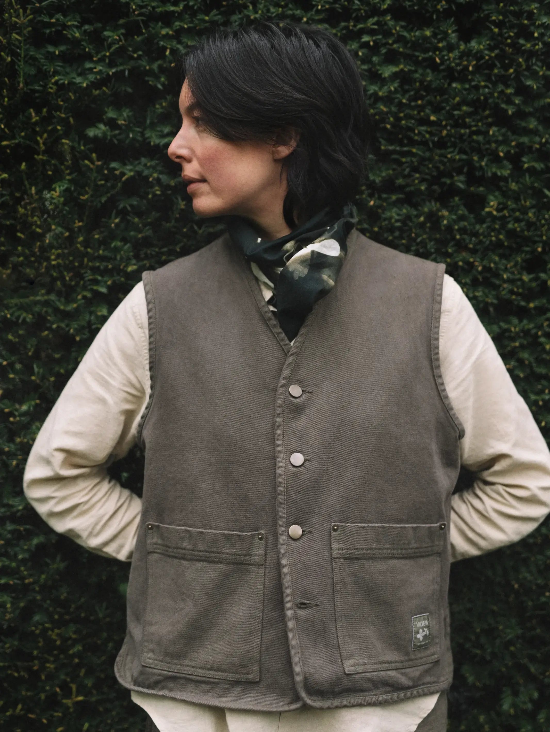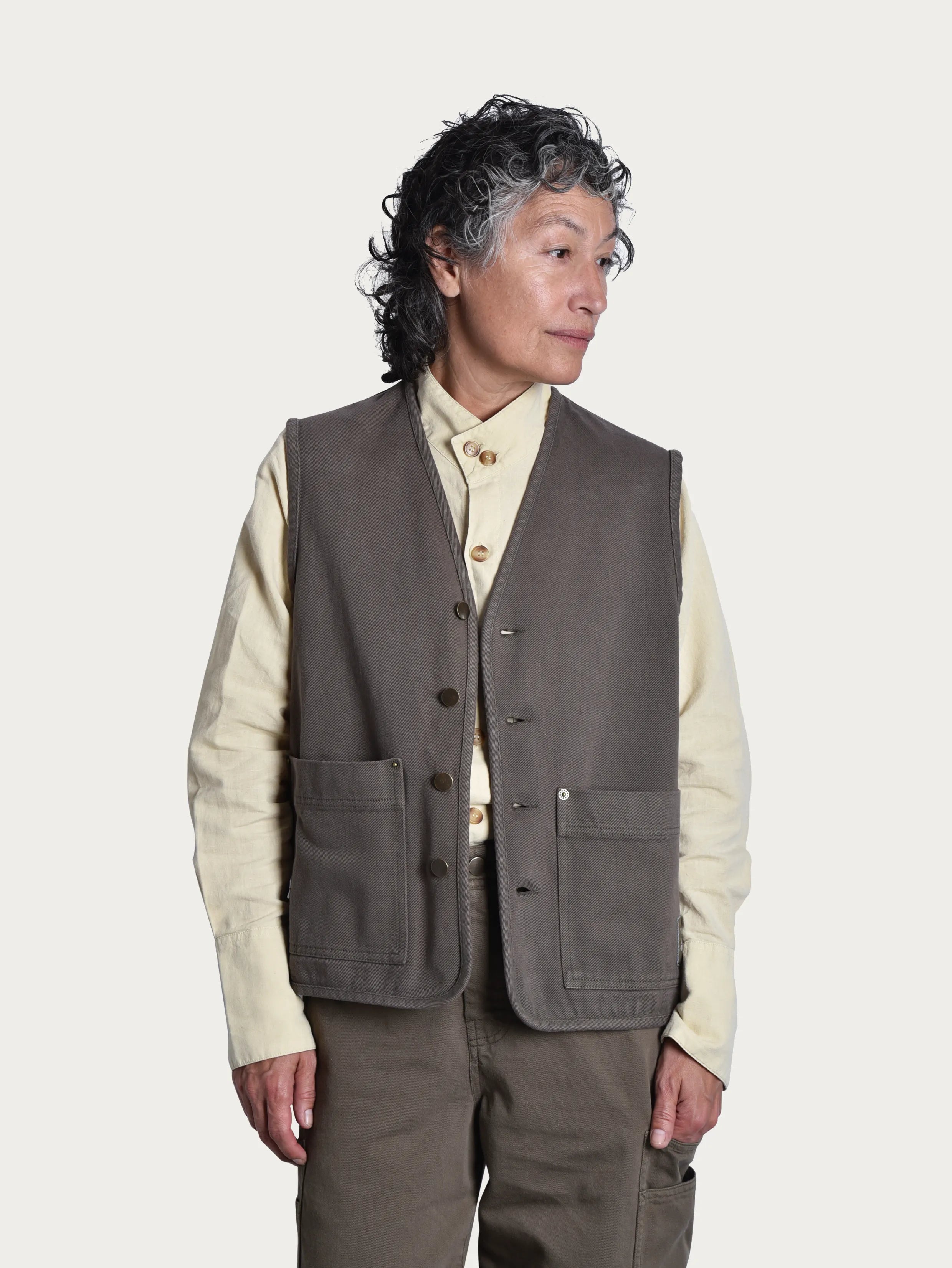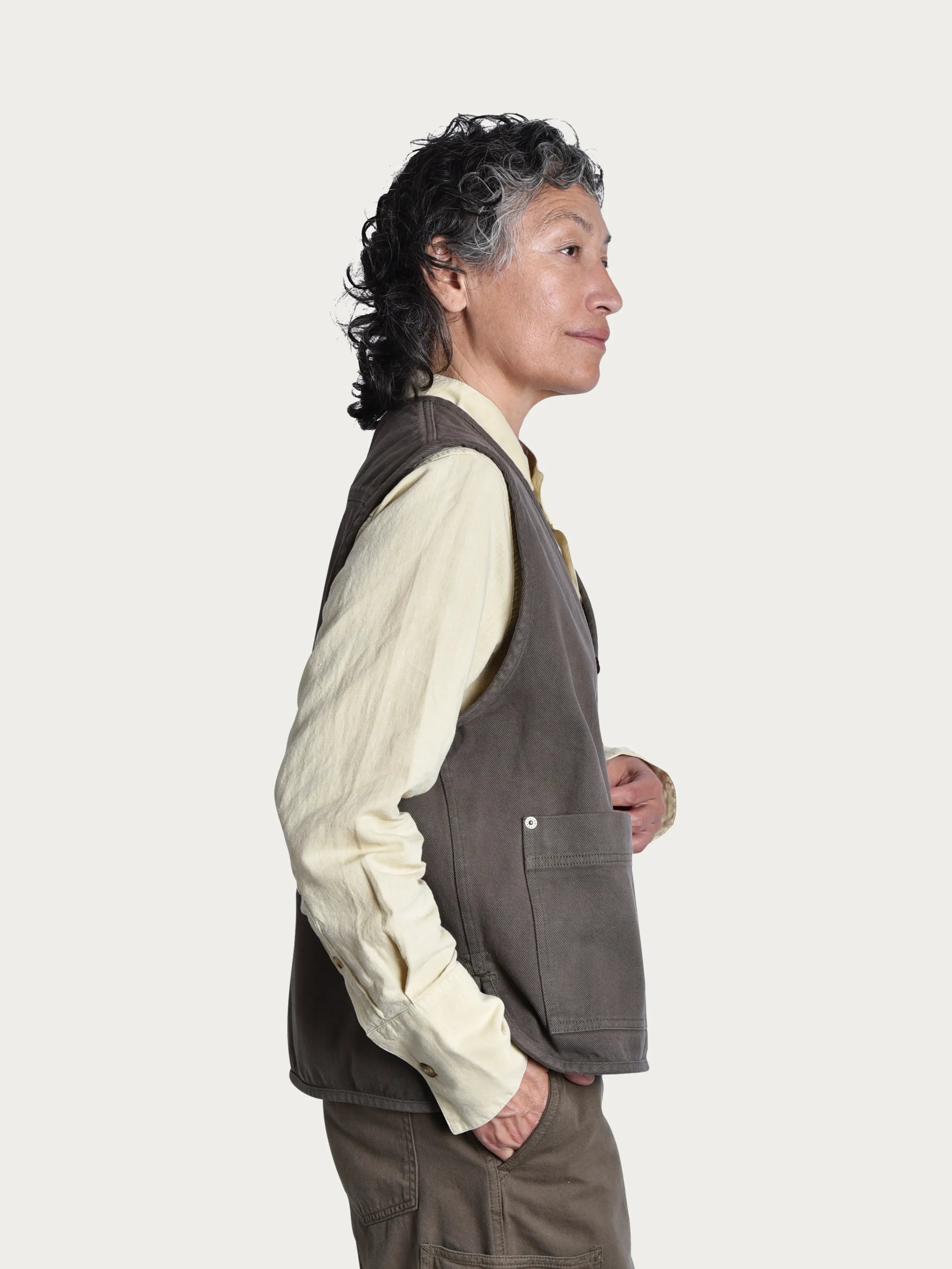 Trädgårdsvästen Ro är ett plagg för rörelse. Tillverkad i 100 % ekologisk bomull med en mjuk men robust känsla och knappar i patinerad metall. De generösa fickorna rymmer dessutom allt från sekatörer till fröpåsar.