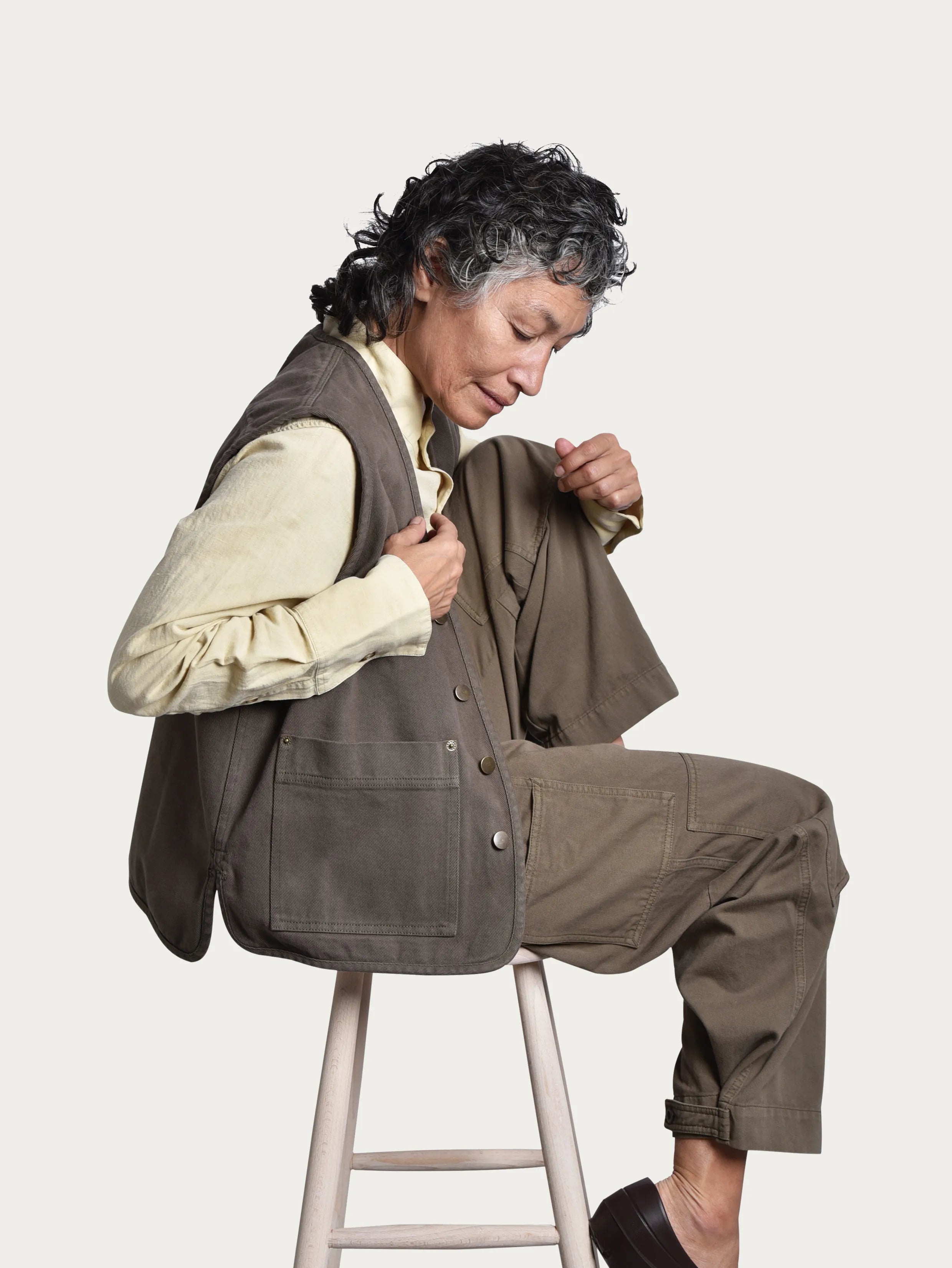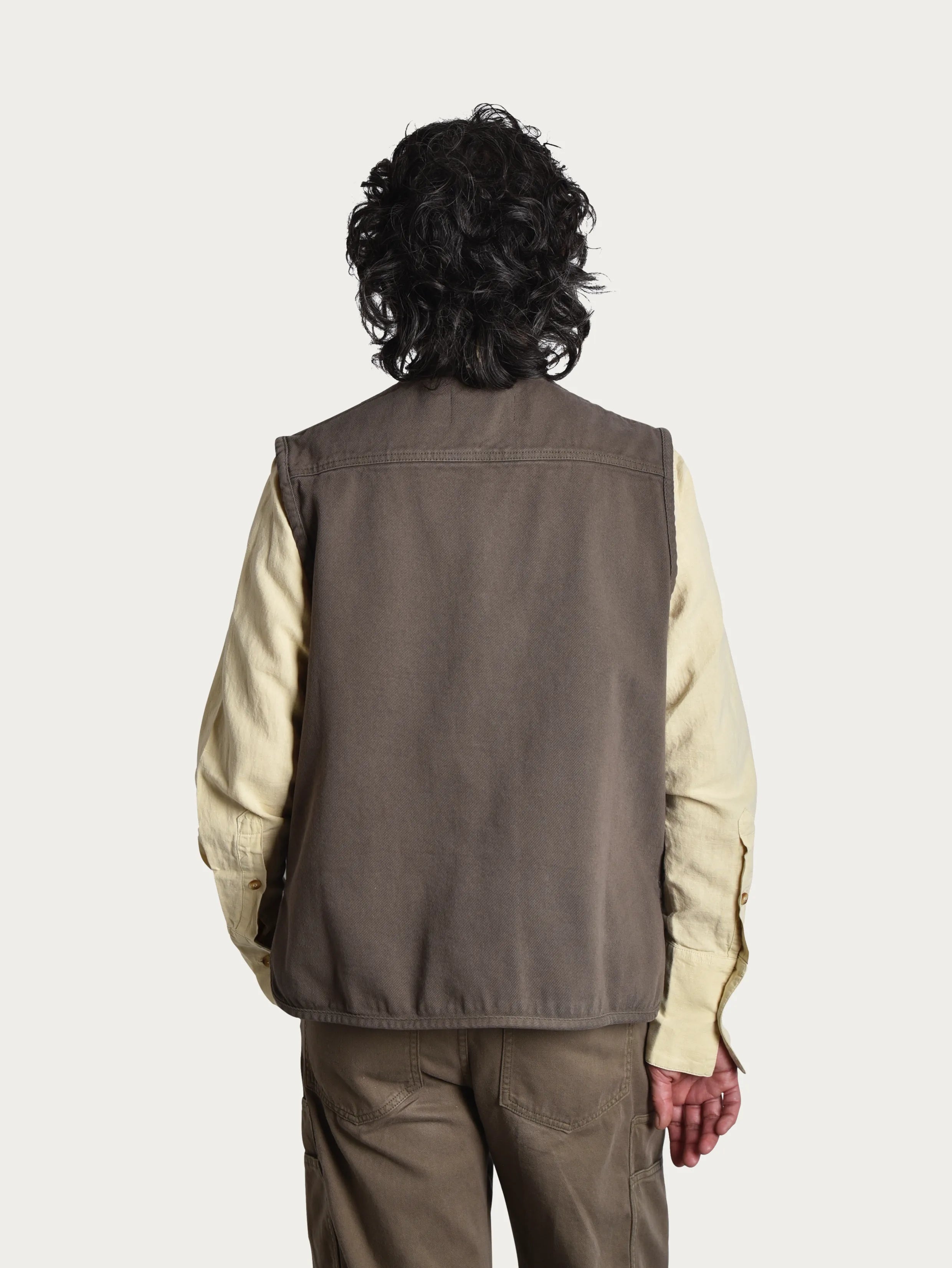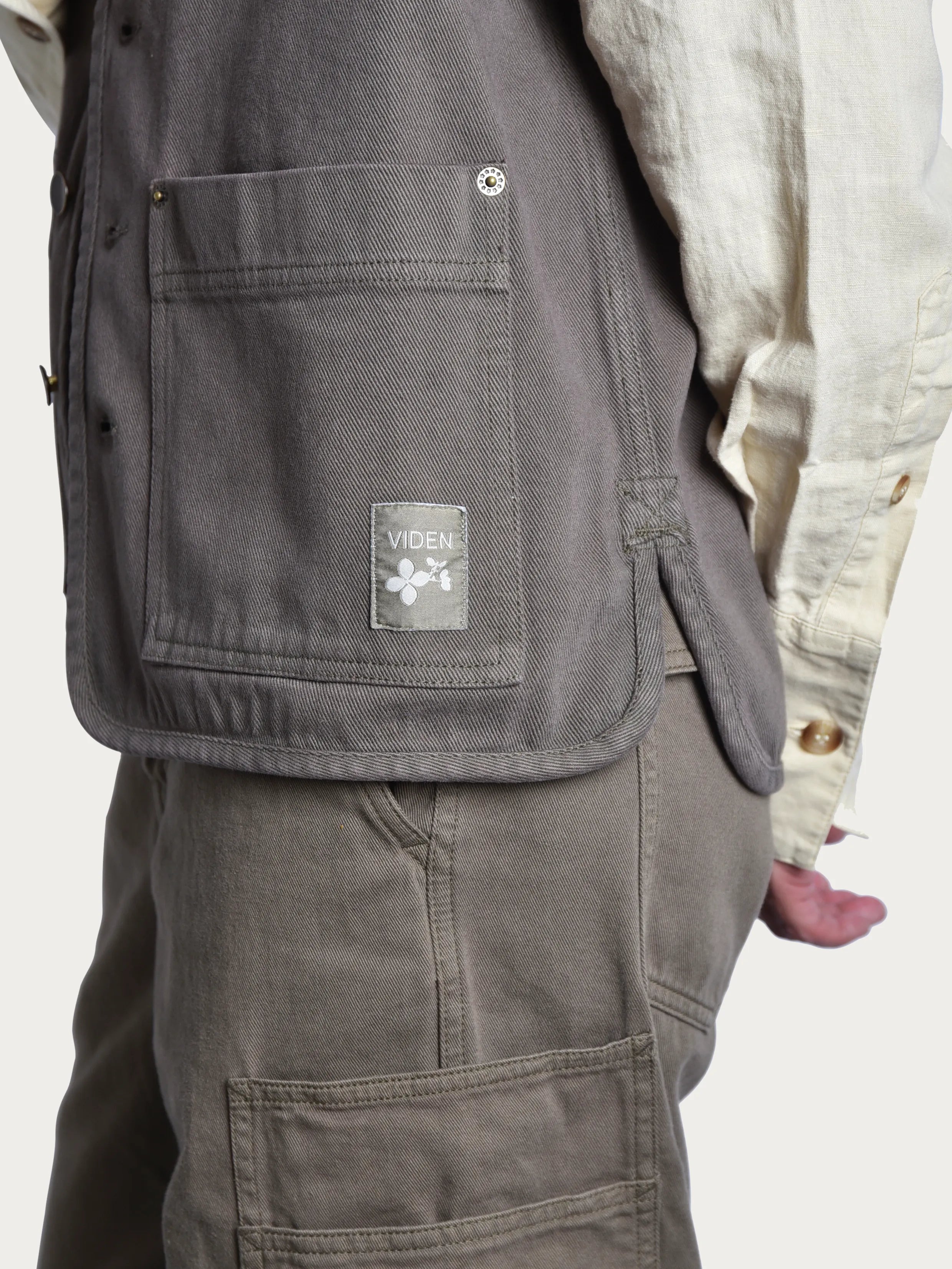 Trädgårdsvästen Ro är ett plagg för rörelse. Tillverkad i 100 % ekologisk bomull med en mjuk men robust känsla och knappar i patinerad metall. De generösa fickorna rymmer dessutom allt från sekatörer till fröpåsar.