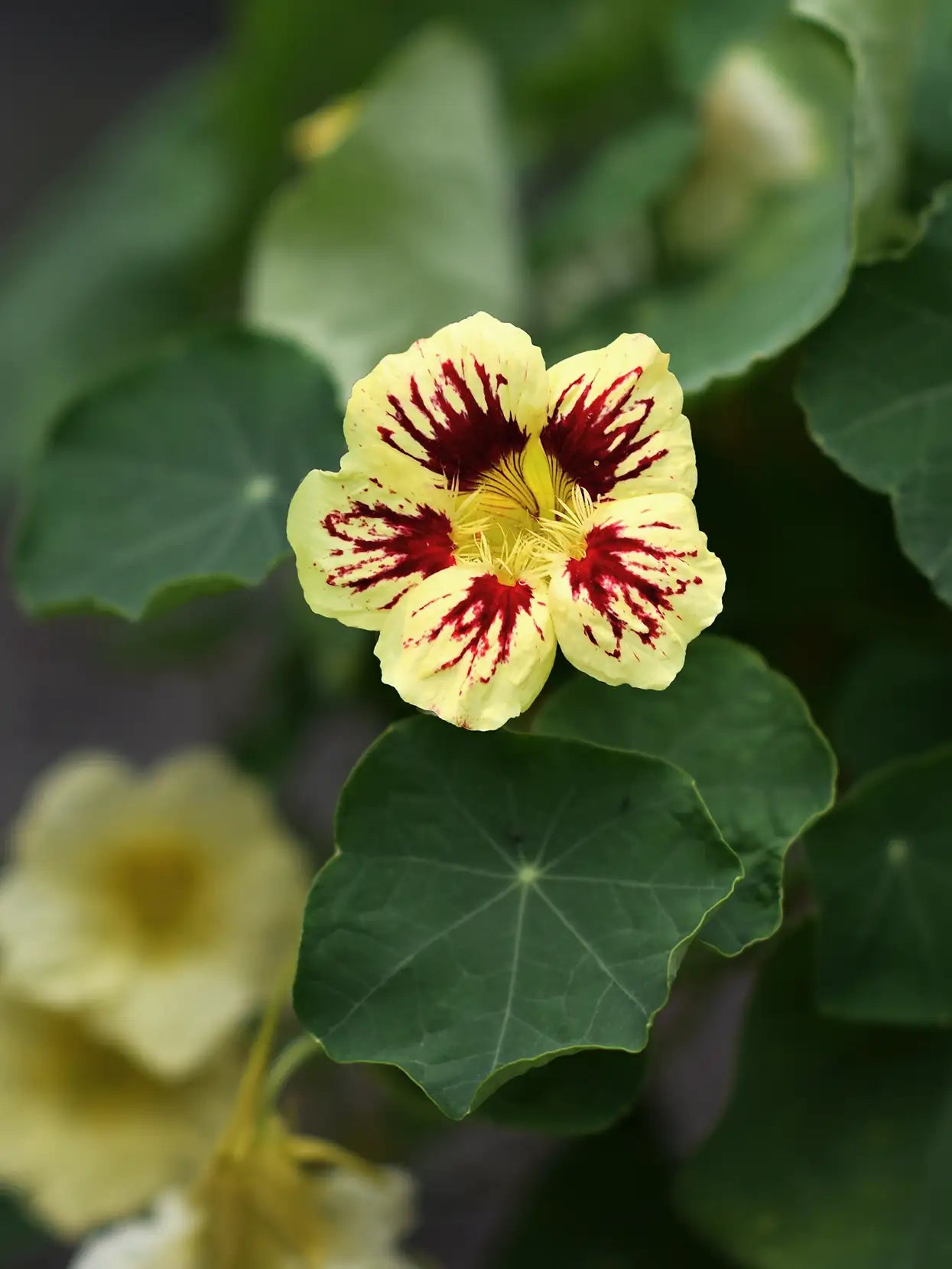 Dvärgkrasse 'Orchid Cream' får krämiga ljust gula blommor med vinröda fläckar vilket gör denna krasse gjord som för en närmare titt. Perfekt i köksträdgården, krukor och rabatter. Blommor och blad är ätbara med en pepprig smak. Lätt att odla. Attraherar pollinatörer.