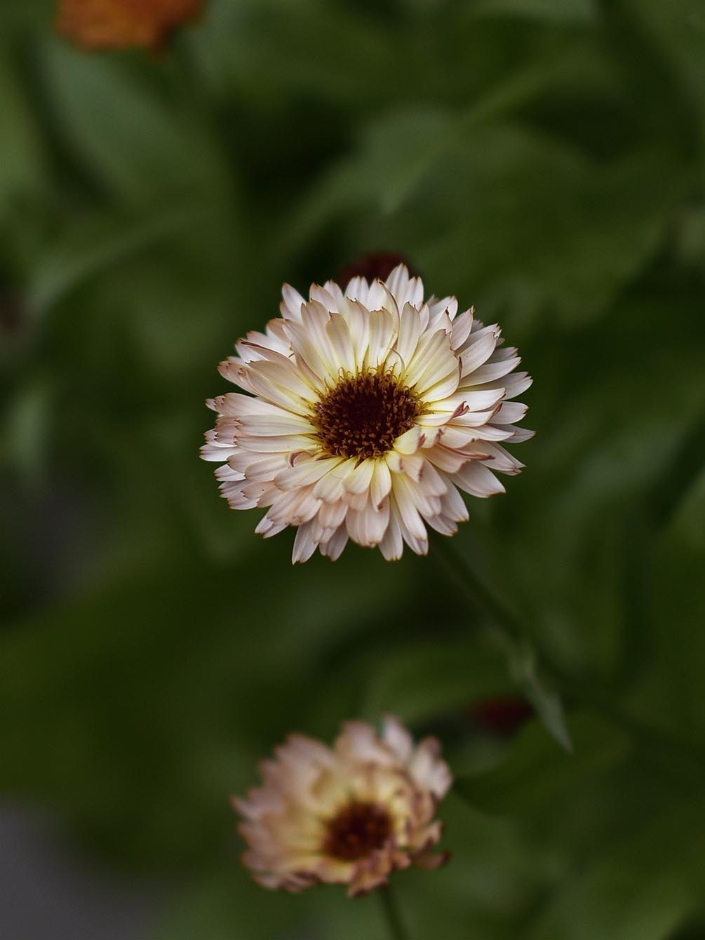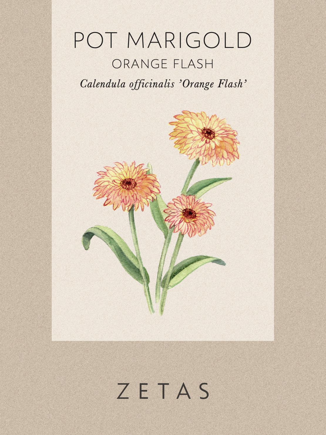 Ringblomma ’Orange Flash’ är en riktig glädjespridare med sina relativt stora dubbla blommor i gyllengula och rosa färgnyanser med inslag av brons. Blommans struktur tillsammans med de blandade färgerna gör att den påminner om ett ulltyg i tweed. Den är lättodlad och levererar rikligt med blommor som också går att äta. Det gör också att den passar fint i kökslandet tillsammans med alla andra ätbara växter. Ringblomman går även med fördel att odla i kruka på balkonger och terrasser.