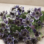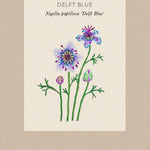 Jungfrun i det gröna 'Delft Blue' får massor av blåvita, täta, halvt till helt dubbla, små blommor i välgrenade klasar. Buskigt växtsätt med djupt grönt bladverk. Fin, lättodlad perenn till rabatter, stenpartier och buketter.