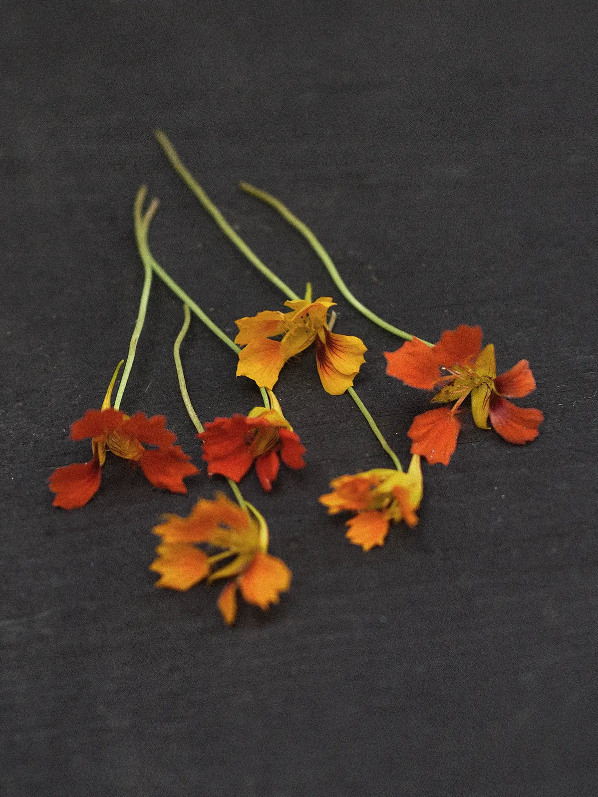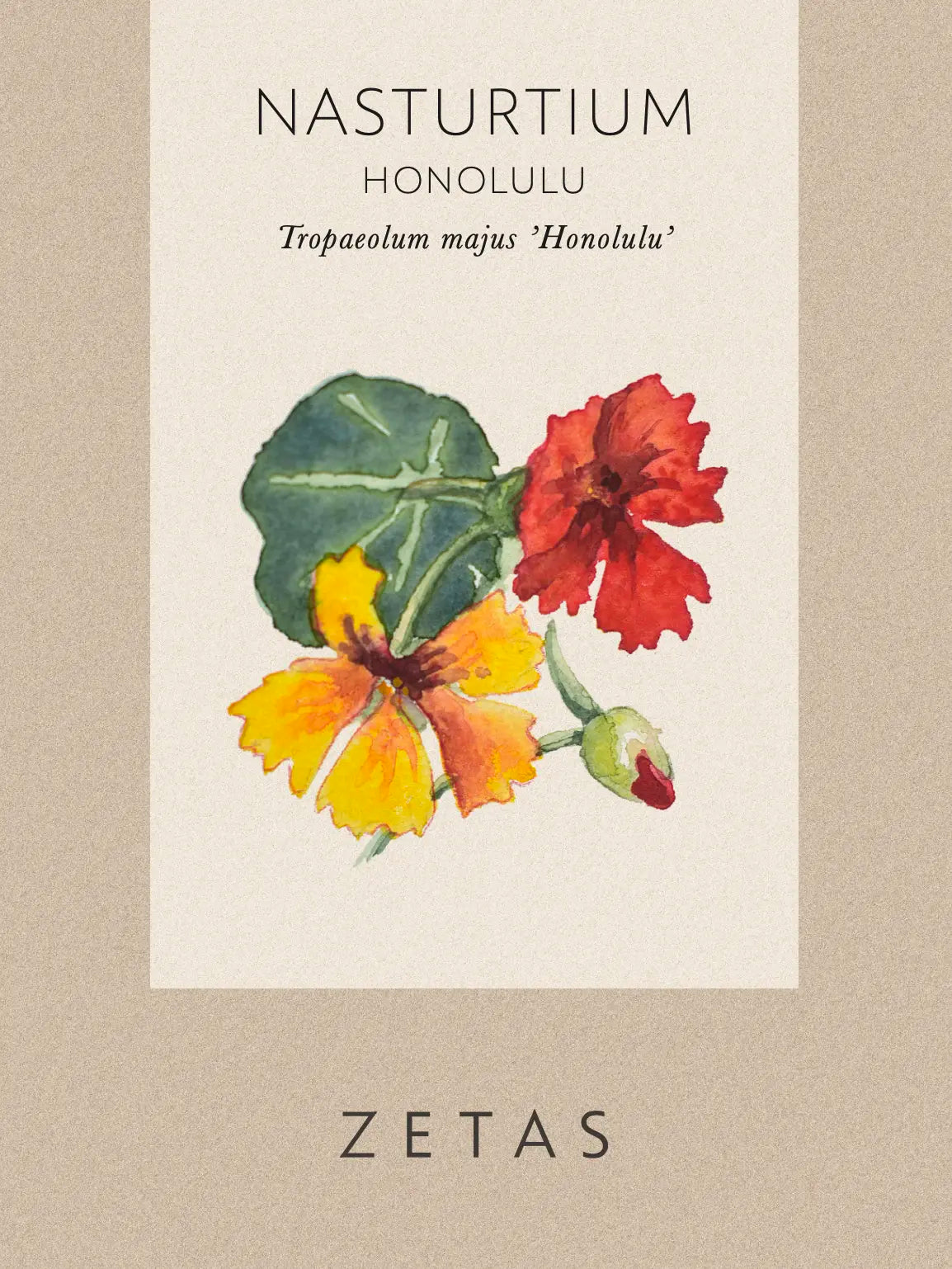 Dvärgkrasse 'Honolulu'. Levande blandning av eldiga nyanser, vissa blommor är tvåfärgade. Tandade och kluvna kronblad. Blommor har en pepprig smak. Lätt att odla. Attraherar pollinatörer.