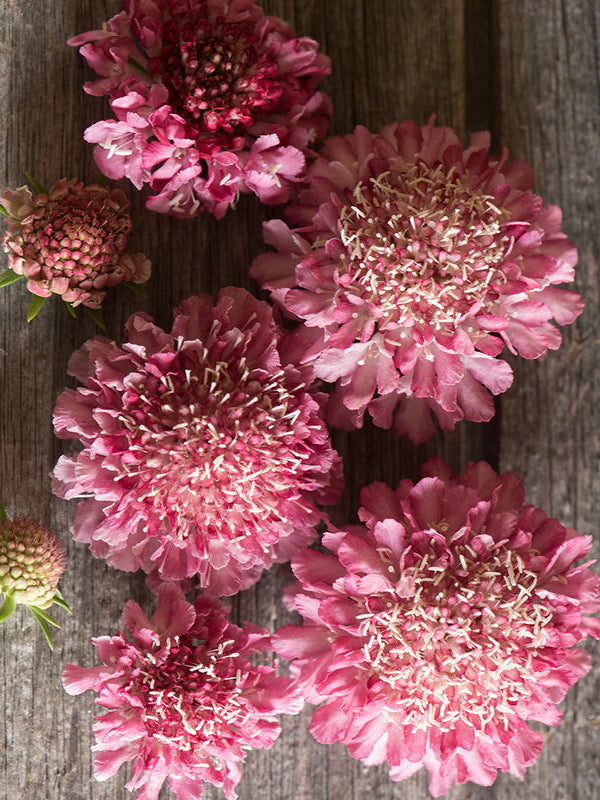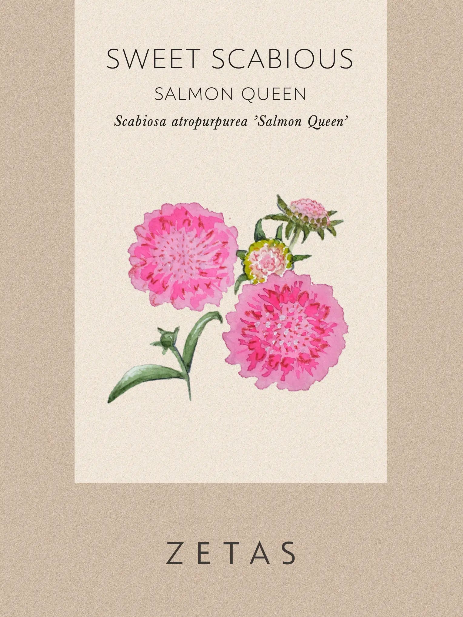 Praktvädd 'Salmon Queen'. Härligt doftande blommor i rosa nyanser på höga, smala men starka stjälkar. Denna är en favorit i både rabatter och buketter. Utmärkt snittblomma som även kan torkas. Attraherar bin, humlor och fjärilar. Rådjur resistent.