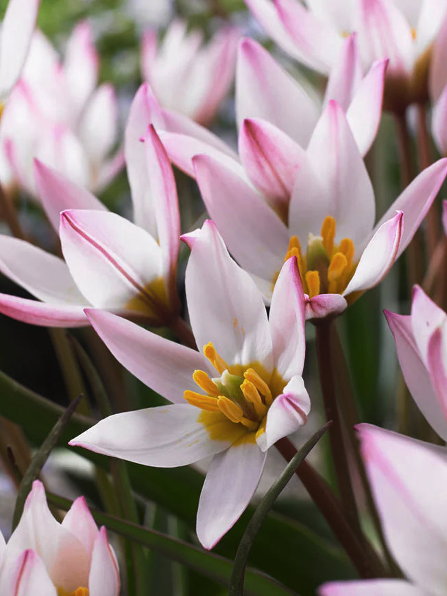 Tulpan 'Hilde', tulipa cretica ’Hilde’ är en botanisk tulpan som blommar med flera blommor på stängeln. Blommorna skiftar i färg med rosa utsida och vit insida. De öppnar sig mot solen och sluter sig vid molnigt väder. Plantera i grupper ca 10 cm djupt.