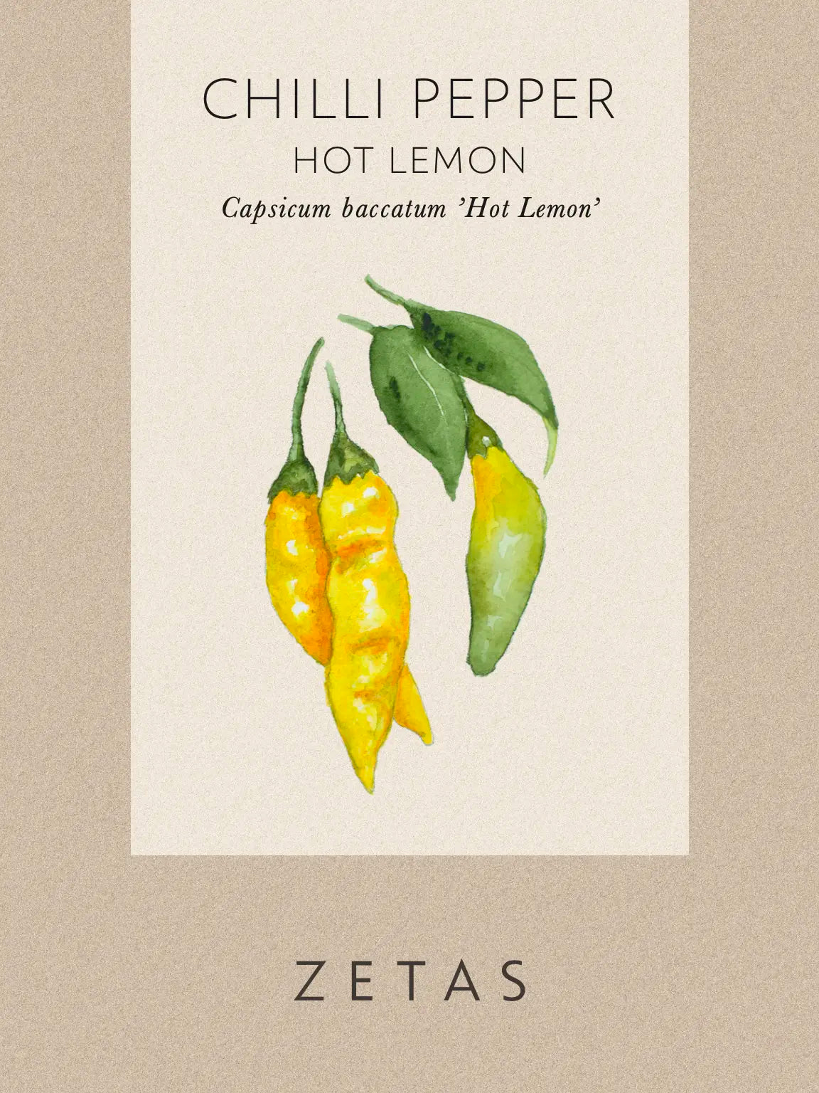 Chilipeppar 'Hot Lemon'. Dekorativ, medelstark chili med läcker citrussmak. Utmärkt både färsk och torkad. En vacker krukväxt på uteplatsen. De glänsande, gula frukterna står i kontrast till det gröna bladverket. Frukterna är 6-8 cm. Kryddighet: 25 000-30 000 Scoville.