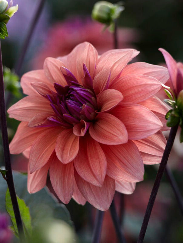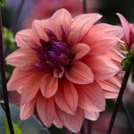 Dahlia ‘American Dawn’ är en mellanstor sort med färger som för tankarna till sensommarens glödande solnedgångar. De näckrosformade blommorna blir omkring 15 cm stora och kombinerar en lila mitt med varma orange kronblad för ett spektakulärt, nästan tropiskt uttryck. En perfekt dahlia för den eklektiska trädgården eller som blickfång i buketter.