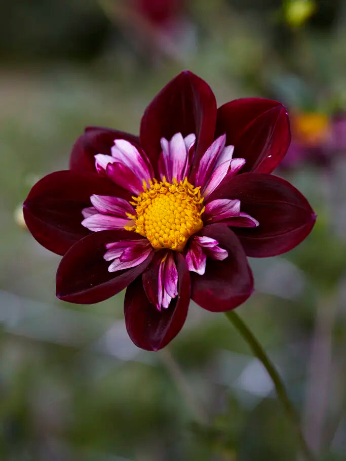 Dahlia ’Joyful Investment’ är en prisbelönt och speciellt vacker dahlia och vi förstår varför. Blommorna har mörkt vinröda kronblad, ett bedårande mittkrås i vitt och rosa och en varm gul mitt. De eleganta blommorna står vackert mot det gröna bladverket och är ett spännande blickfång i trädgården. Blommar villigt och passar utmärkt till snitt.