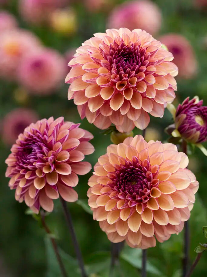 Dahlia ’Palmares’ har mjuka rosa och crèmefärgade kronblad i aprikosbeige med en purpurfärgad mitt som ger ett elegant och akvarelligt uttryck. En exklusiv och dekorativ dahlia i magiskt vackra och spännande färger. Blommar rikligt och står på stadiga stjälkar vilket gör den perfekt till snitt.