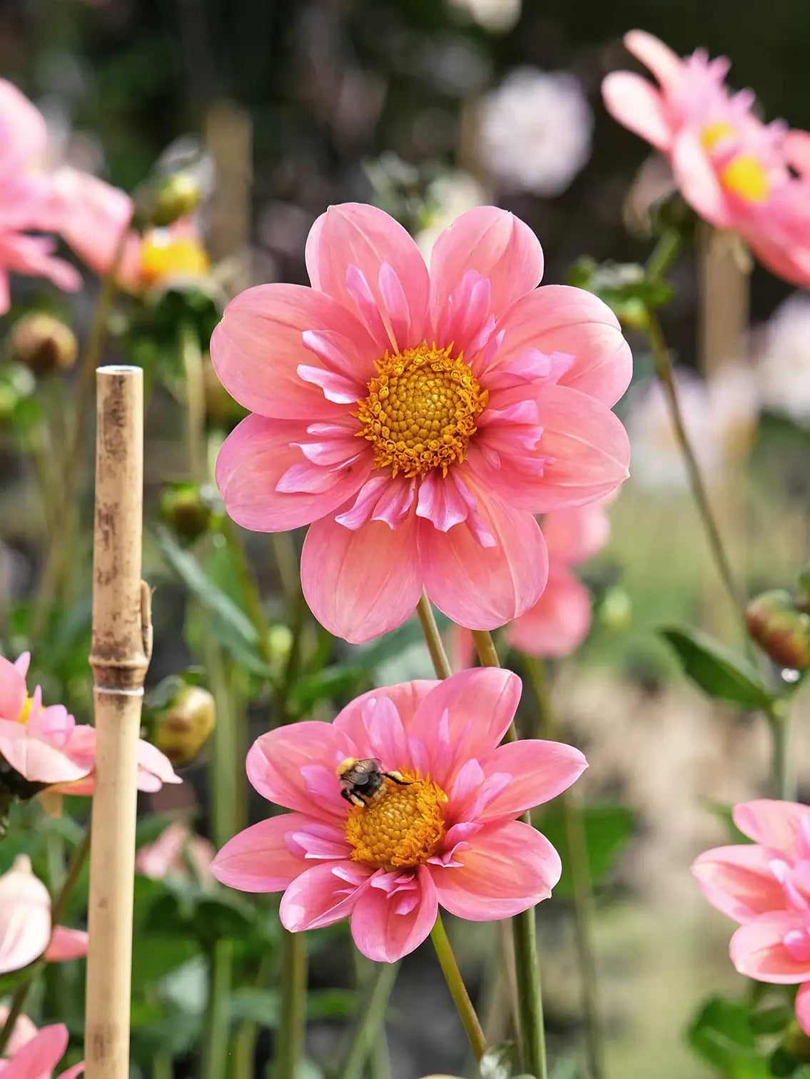 Dahliastickling 'Strawberry Bon Bon' är en ljuvlig halskråsdahlia där de yttre kronbladen är laxrosa/orange. De inre kronbladen övergår i en jordgubbsrosa färg. Den har ett något tätare växtsätt än 'Rhubarb and Custard'. Fantastisk hållbar som snittblomma och har stor dragningskraft hos humlor och bin.