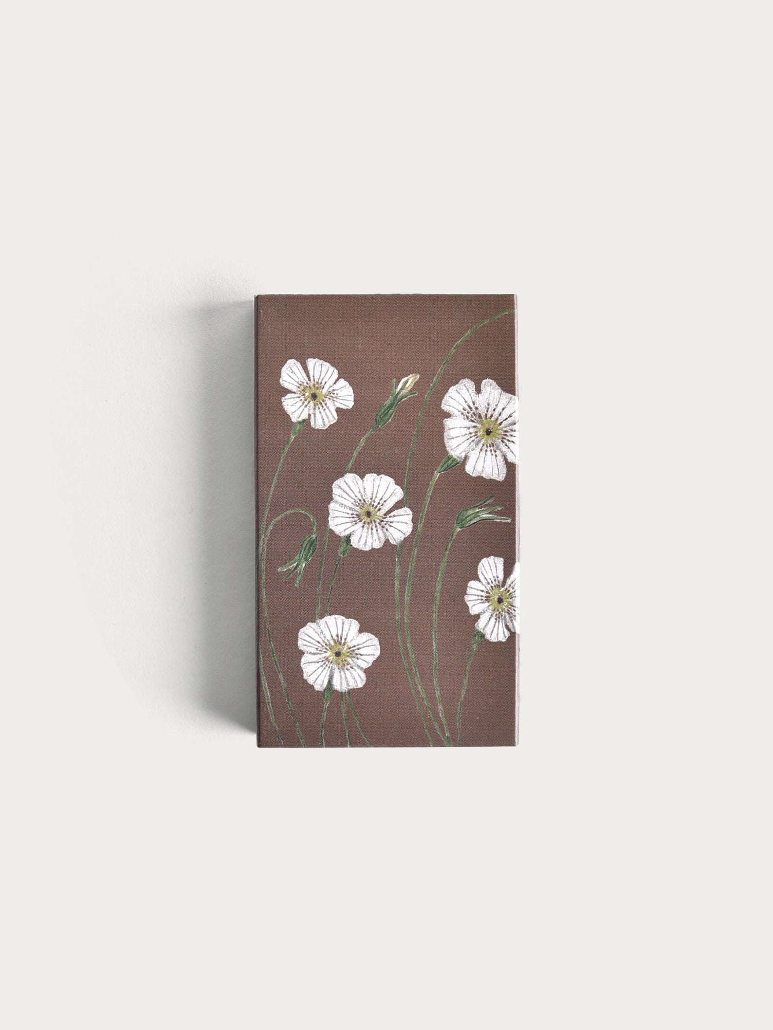 Tändsticksask med extra långa stickor, prydd med ett blomstrande motiv av sommarklätt, agrostemma. Baksidan visar ett unikt fotografi från vår butiksöppning 1975, en hyllning till vår historia och trädgårdsglädje.