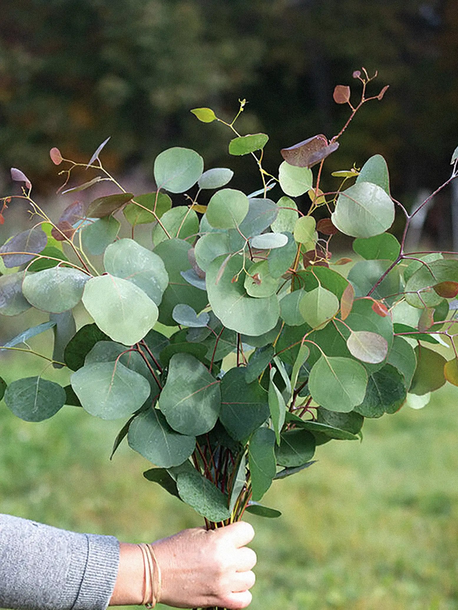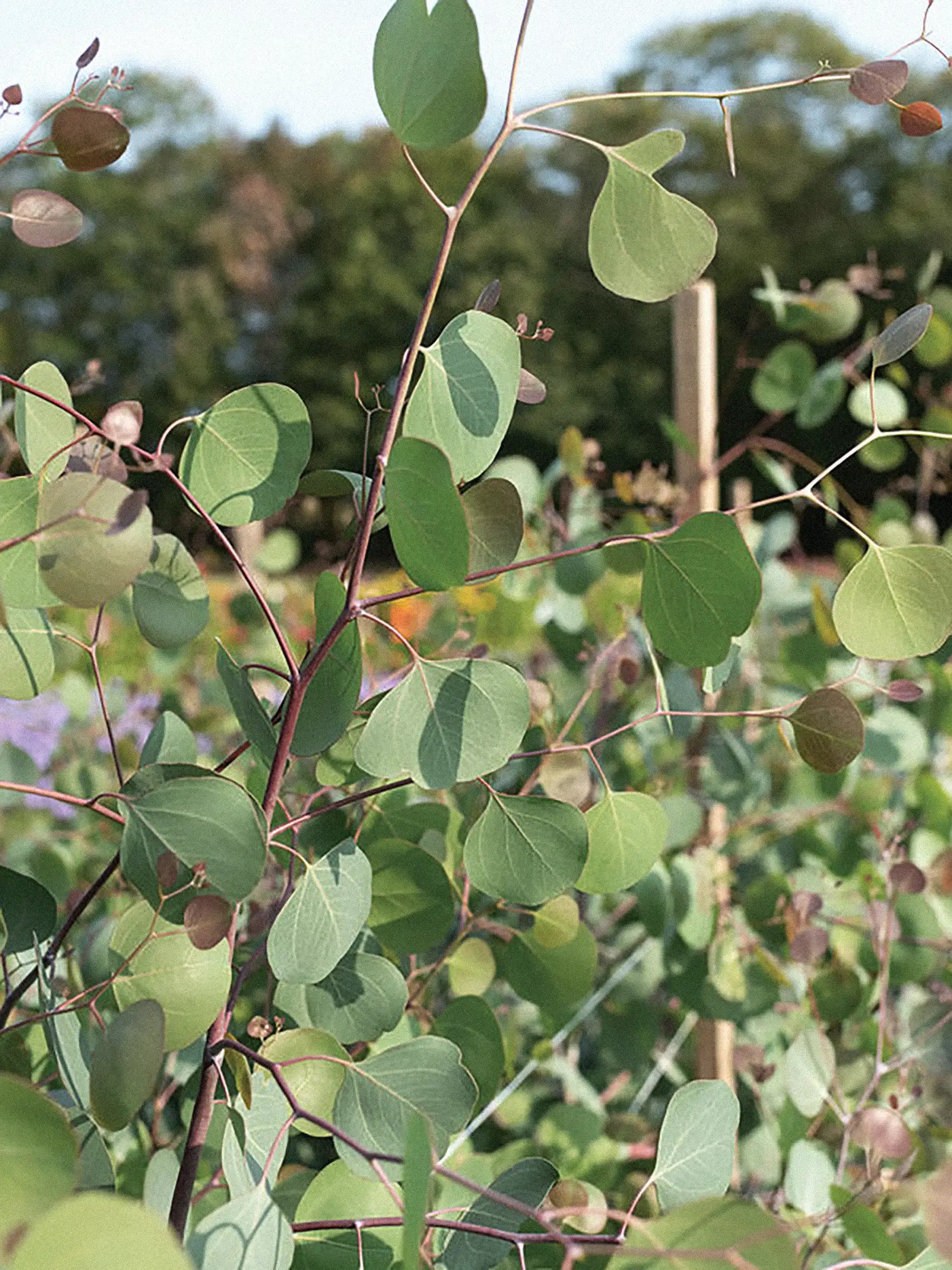 Eukalyptus, Eucalyptus polyanthemos har silvergröna blad som skimrar på höga, kraftiga stjälkar. De silvergrå runda bladen har en stark och härlig doft av eukalyptusolja. Kan användas till rabatter, men är fin i stora krukor. Perfekt att placera utomhus under sommaren och sedan i fönstret inomhus året runt.