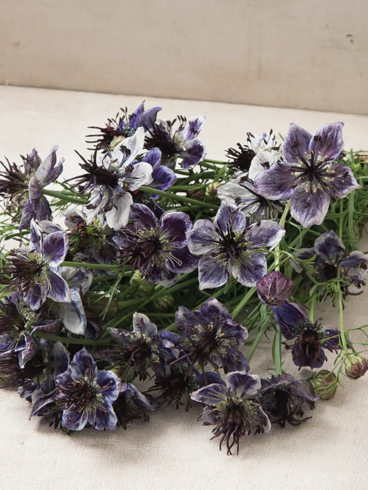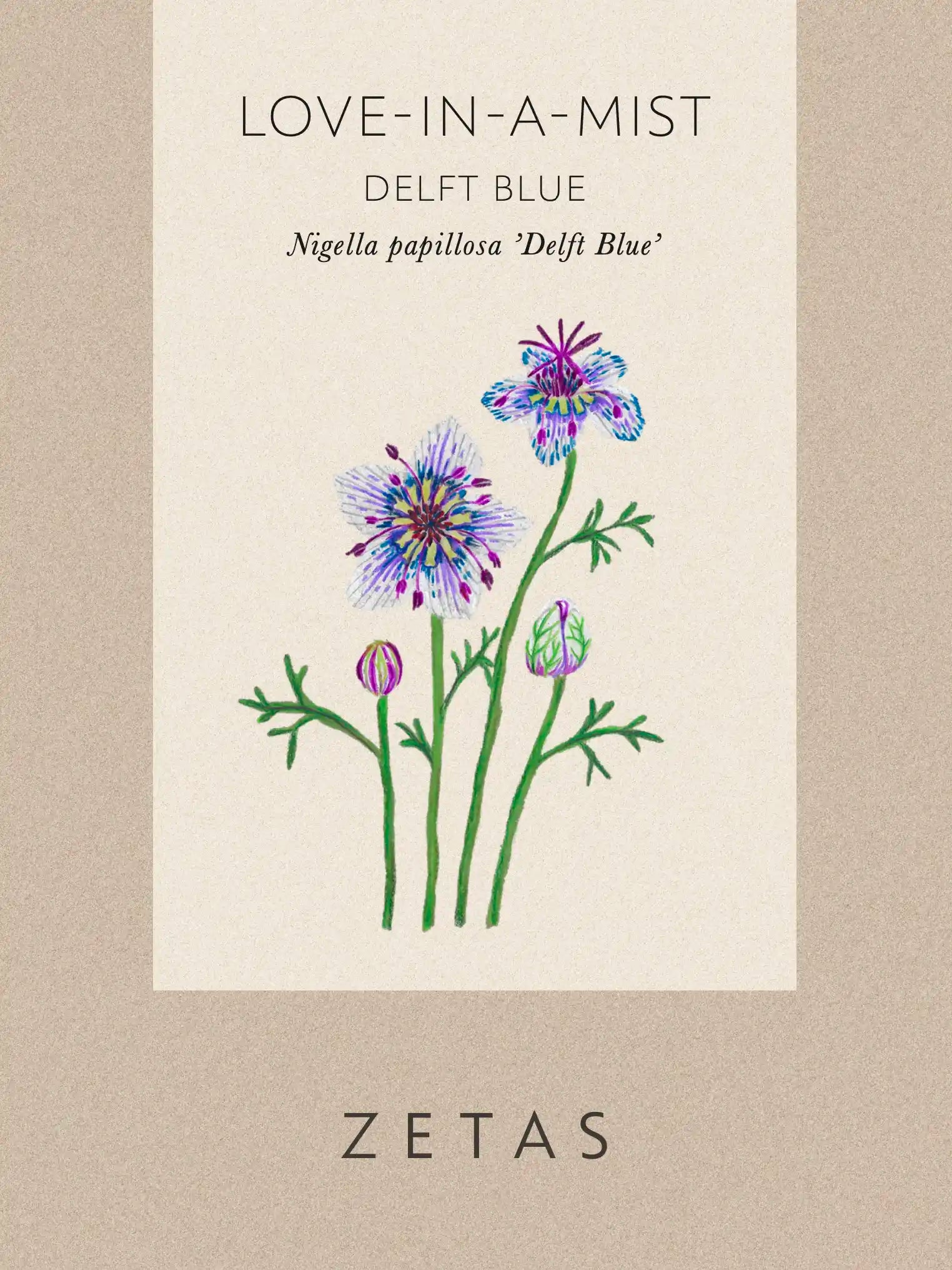 Jungfrun i det gröna 'Delft Blue' får massor av blåvita, täta, halvt till helt dubbla, små blommor i välgrenade klasar. Buskigt växtsätt med djupt grönt bladverk. Fin, lättodlad perenn till rabatter, stenpartier och buketter.