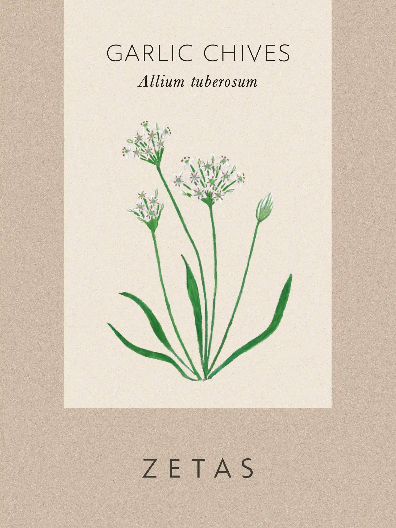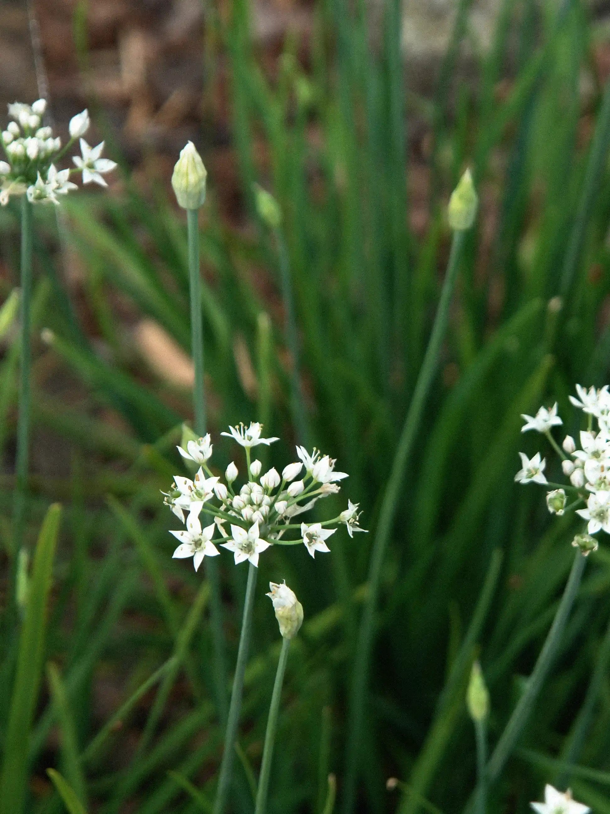 Kinesisk Gräslök har en smak av vitlök och har en massiv, trekantig stjälk. Växterna har tillplattade blad och eleganta vita blommor. Denna sort önskar mer värme och växer långsammare än vanlig gräslök. Det är en flerårig ört.