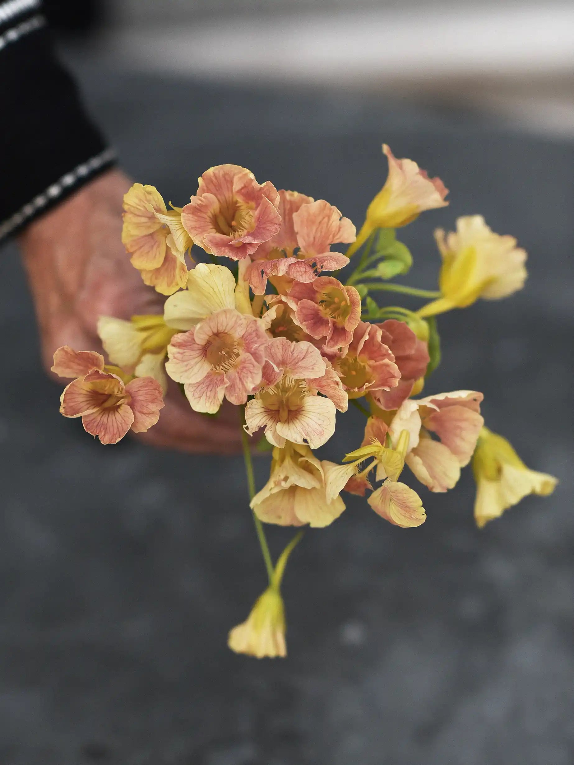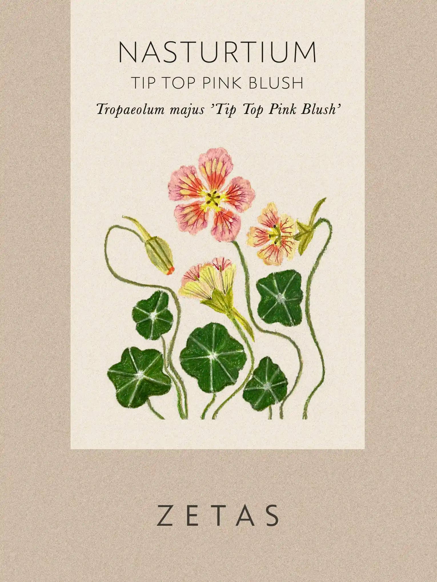 Krasse 'Tip Top Pink Blush' får skira krämfärgade blommor, fint ådrade med aprikosrosa till körsbärsröd färg. Ger ett skiftande vackert mönster över det ljusgröna bladverket. Mycket rik blomning. Blommor och blad är ätbara. Lätt att odla. Attraherar bin och fjärilar.
