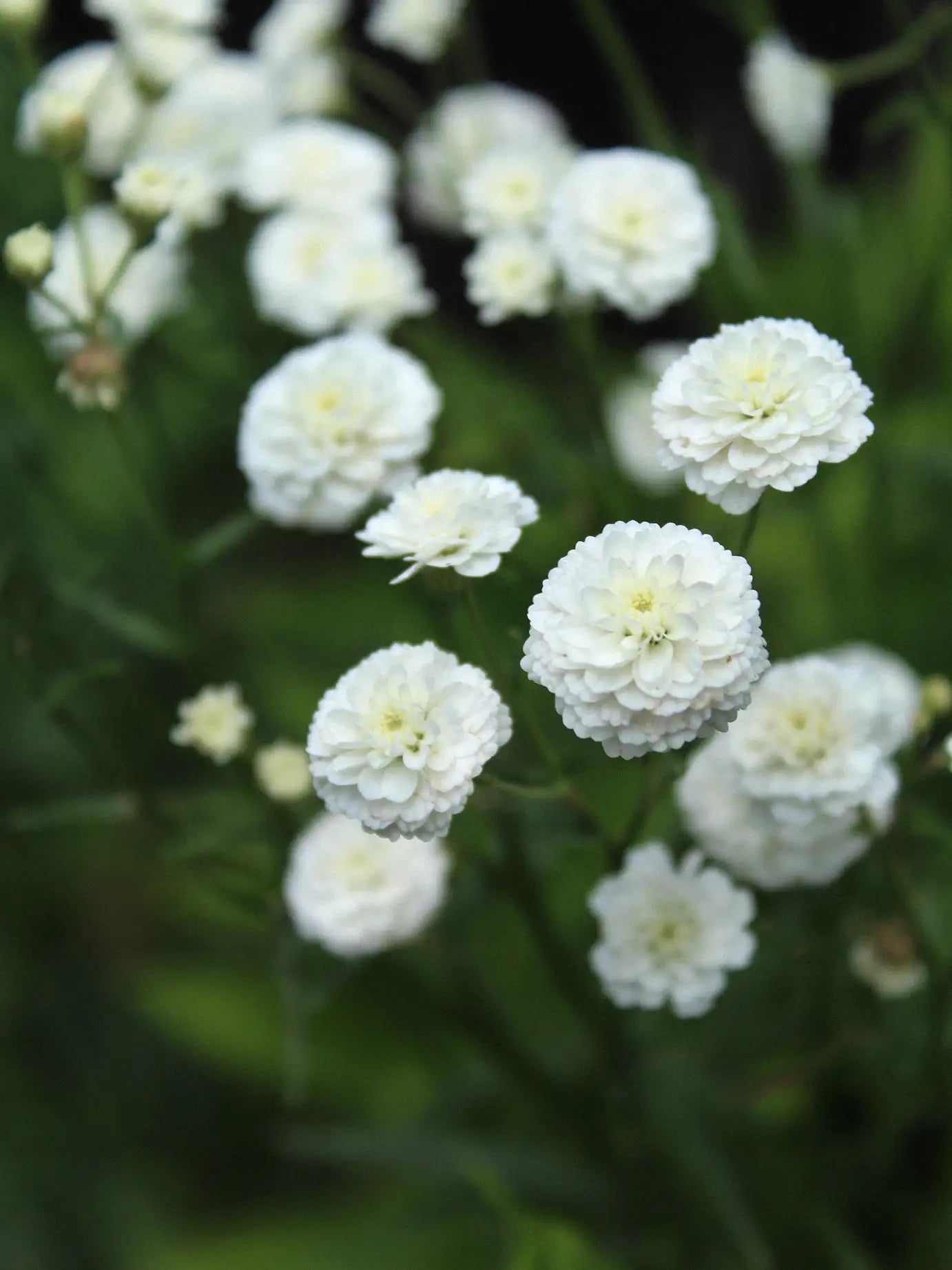 Vitpytta 'Marshmallow' får massor av rent vita, täta, halvt till helt dubbla, små blommor i välgrenade klasar. Buskigt växtsätt med djupt grönt bladverk. Fin, lättodlad perenn för rabatter, stenpartier och buketter. Kan även torkas.