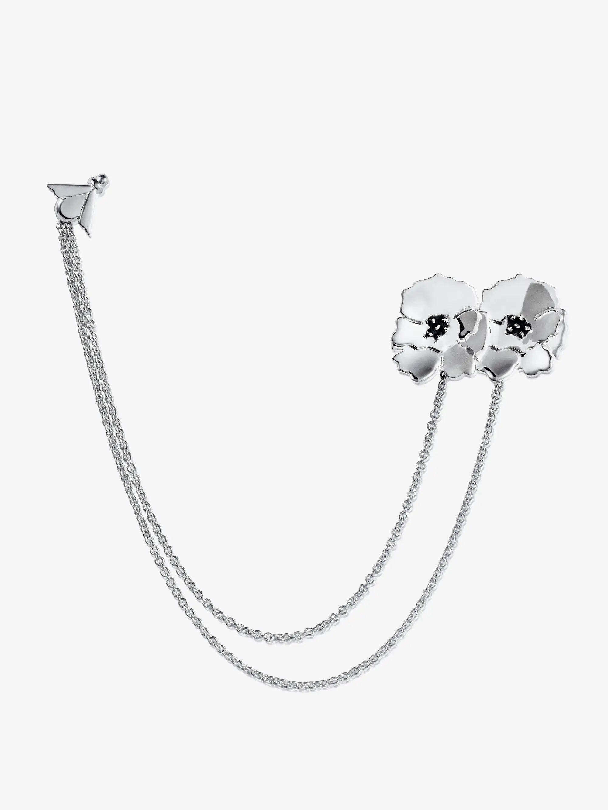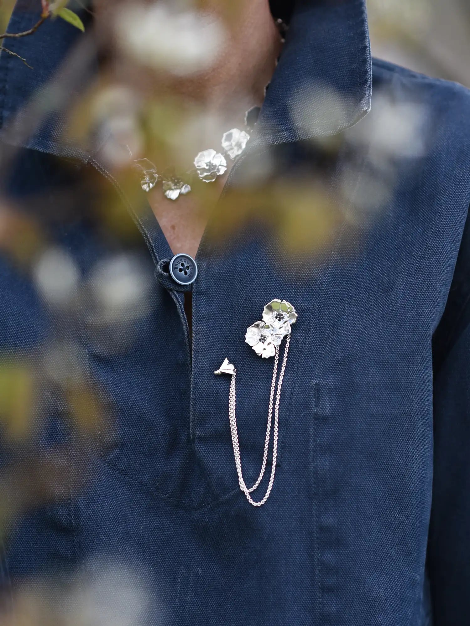 Brosch i återvunnet sterlingsilver med två anemoner och ett bi sammanlänkade med två tunna kedjor för att kunna variera placeringen.