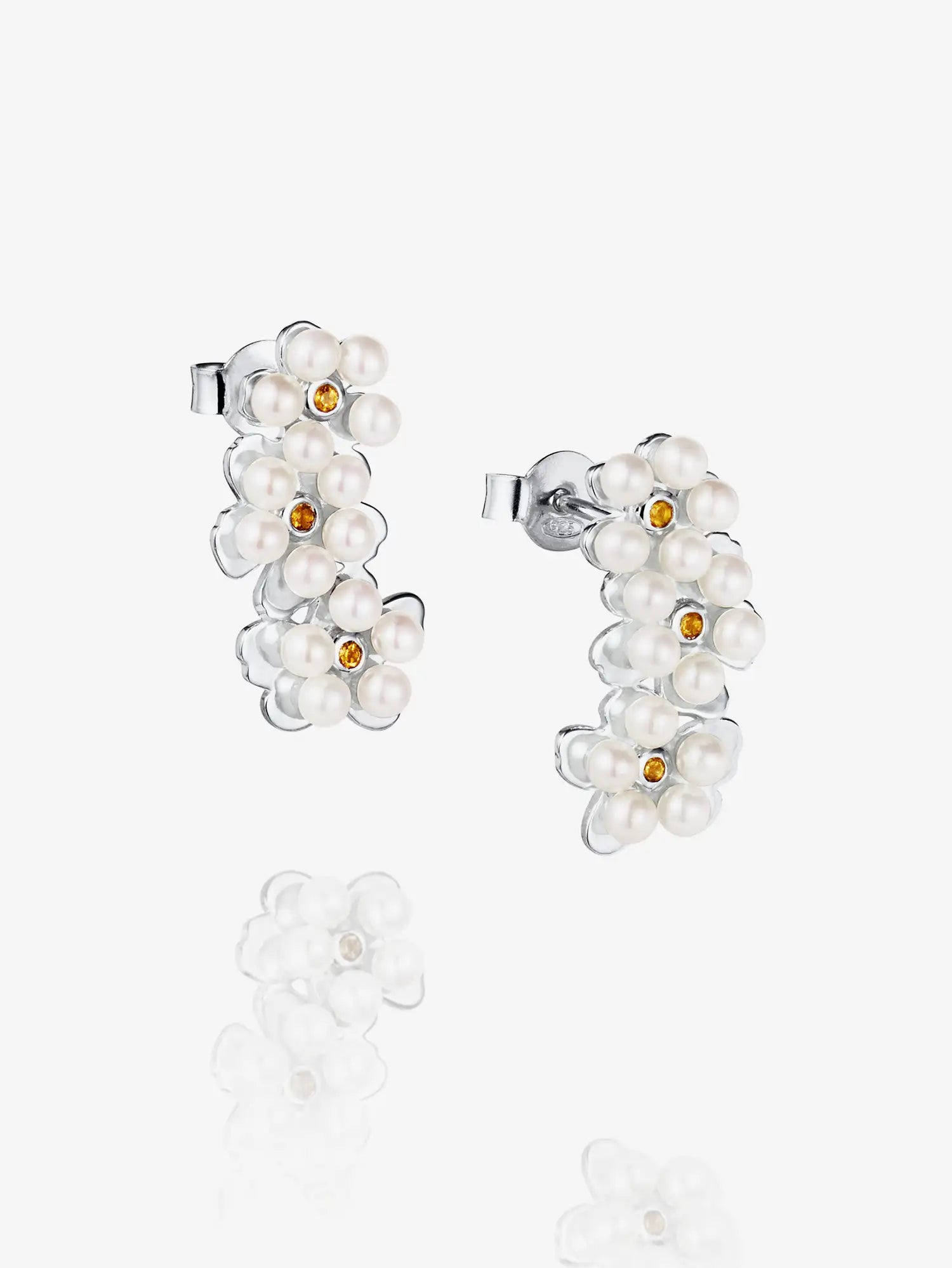 Örhängen i återvunnet sterlingsilver formade som tre stycken förgätmigej dekorerade med sötvattenpärlor och rundslipade citriner.