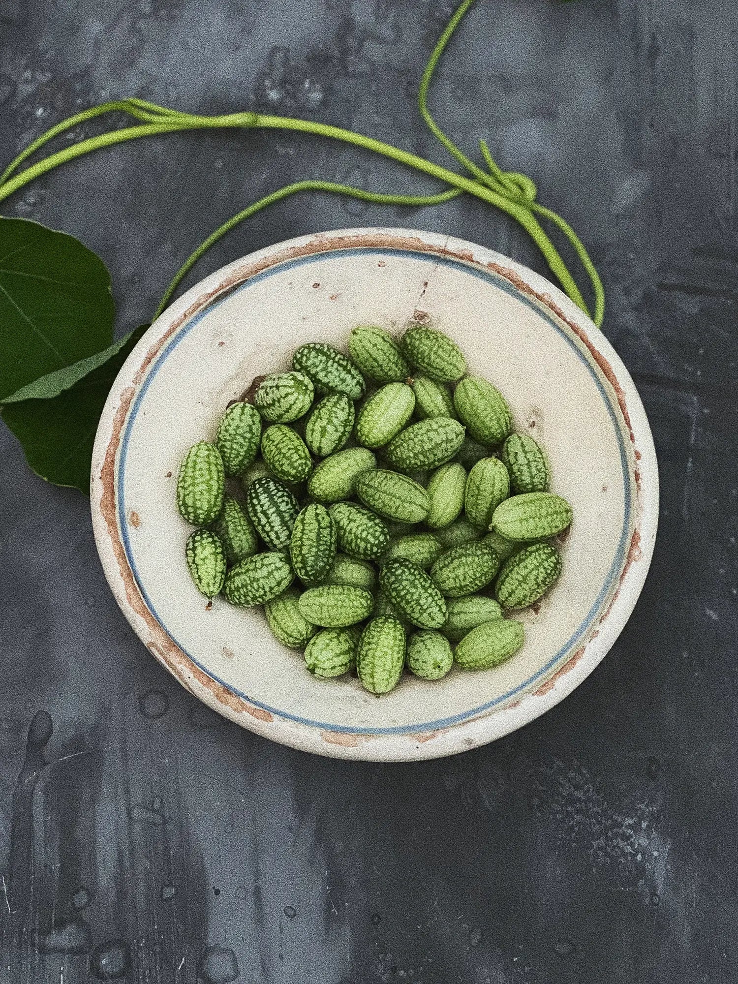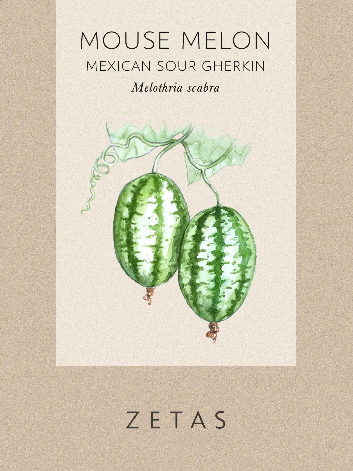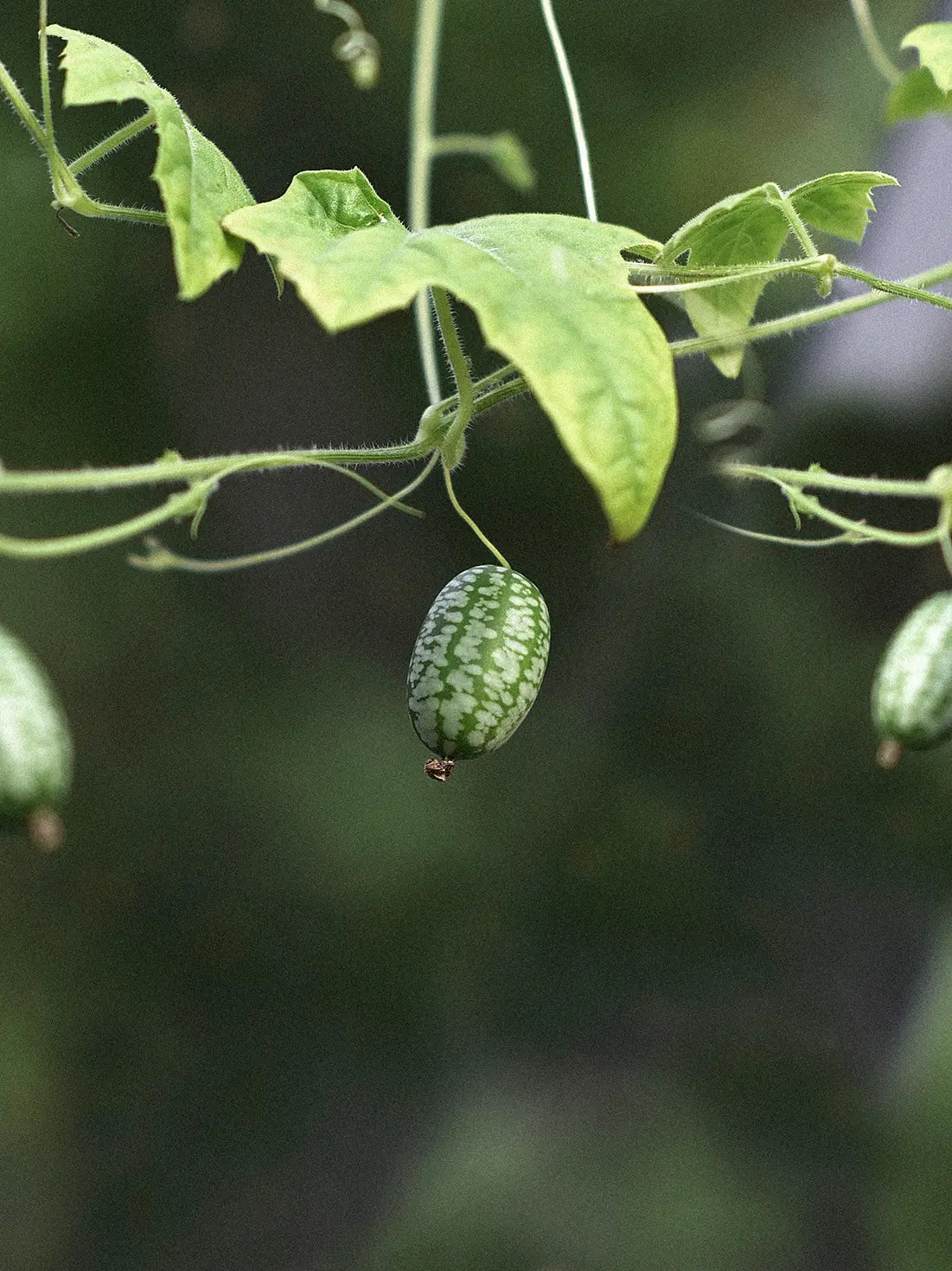 Djungelgurka 'Mouse Melon' är en lättodlad ranka från Sydamerika med en intensiv tillväxt. Ger massor av små, 3-5 cm långa, vackra ovala grönrandiga frukter med mild sötsyrlig smak. Använd färsk i sallad eller inlagd.