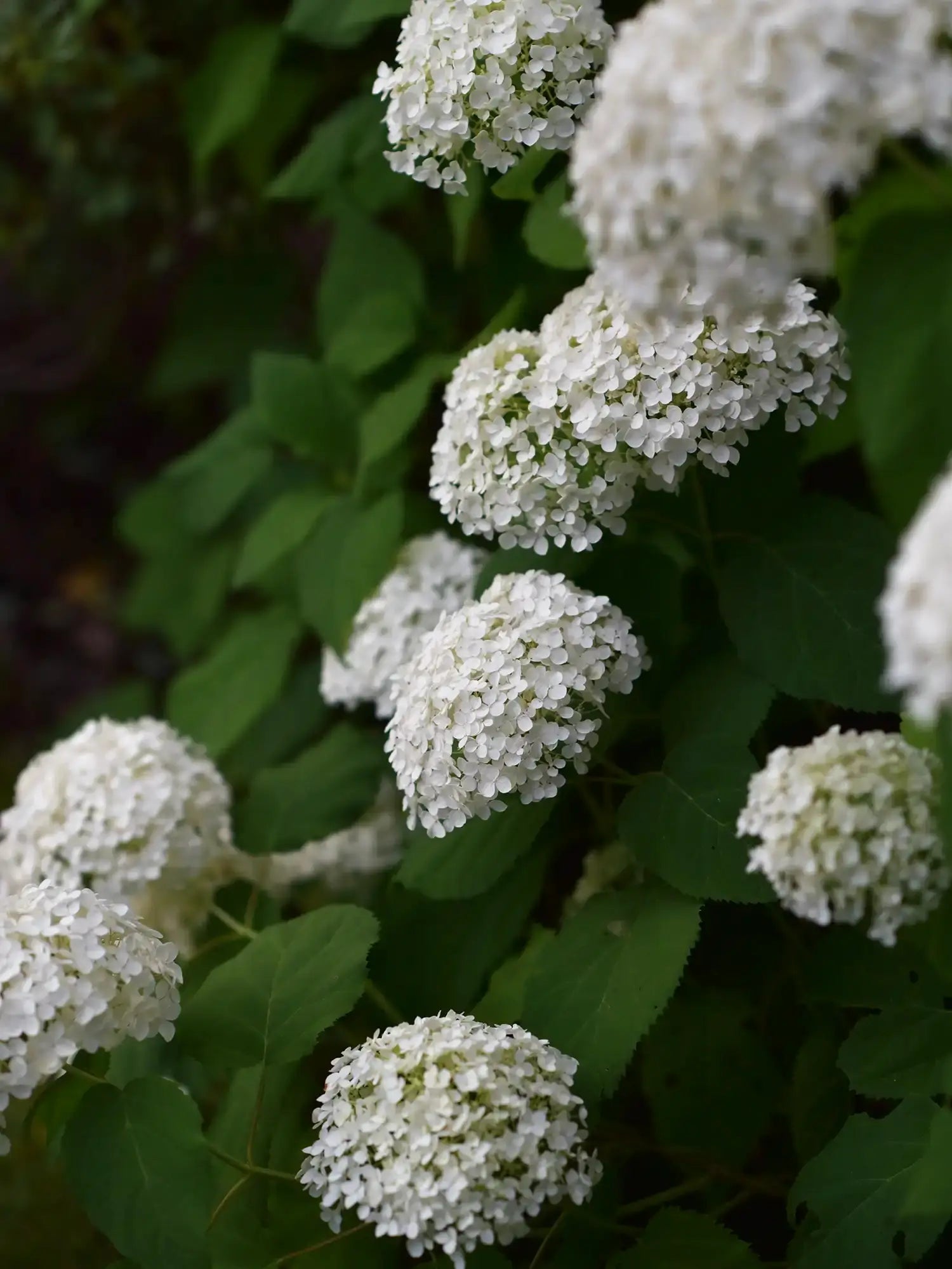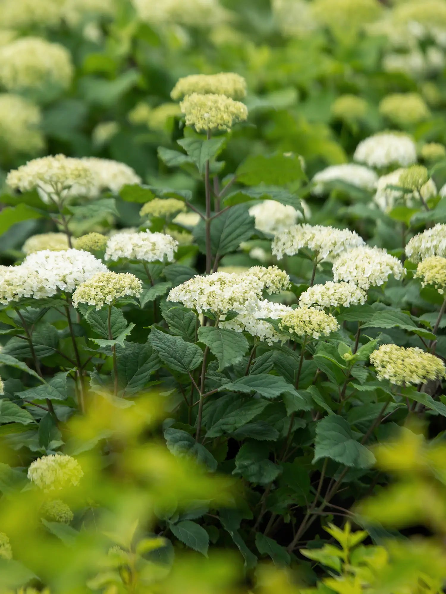 Under högsommaren, från juli, utvecklas stora runda blomsamlingar i en ljuvlig nyans av vitt som skiftar mot limegrönt i knoppstadiet. Blommorna bleknar långsamt till en mjukt krämvit ton och ger ett skirt, romantiskt uttryck i trädgården. Mycket rikblommande från juli och in i september.