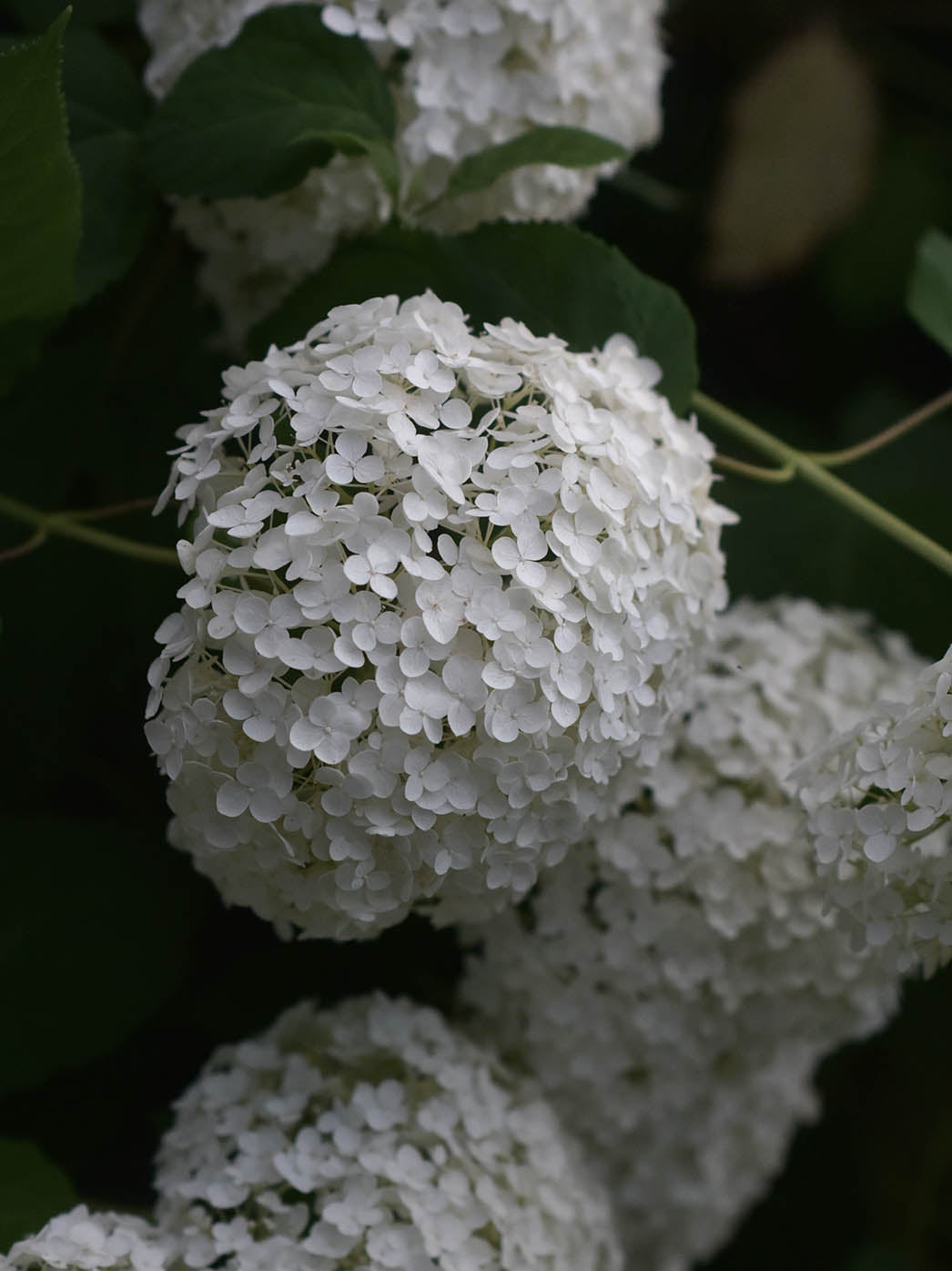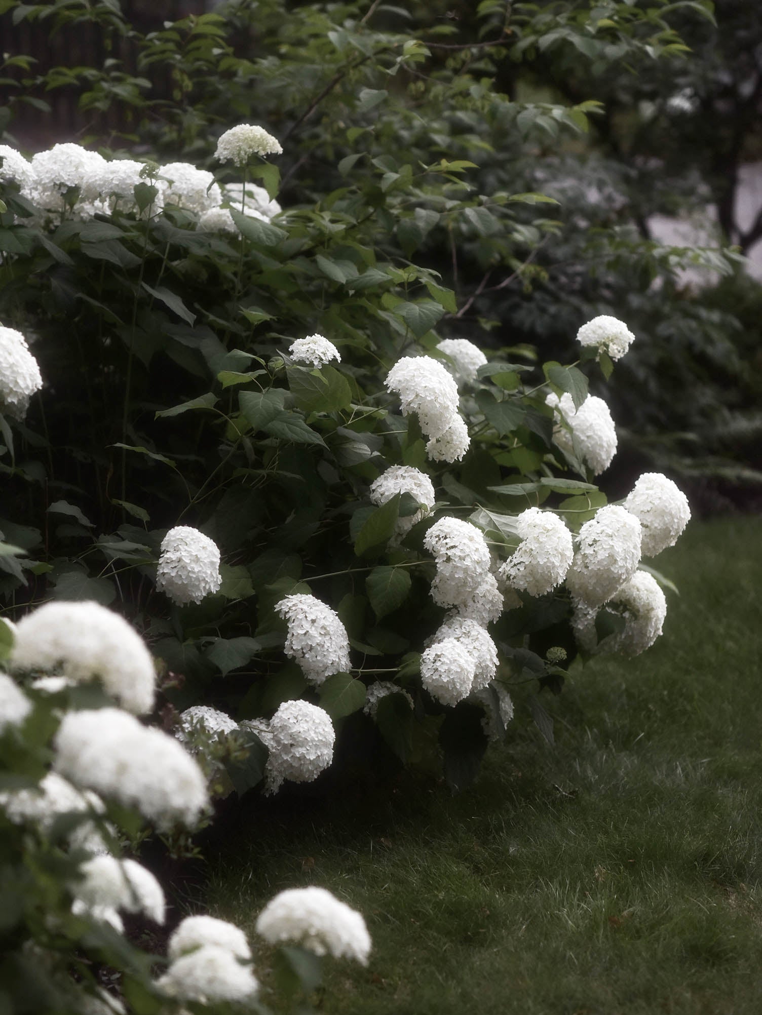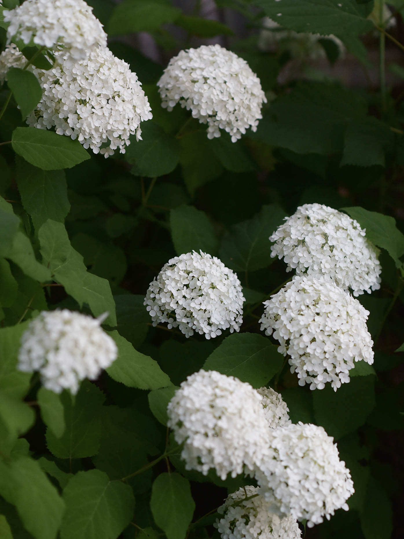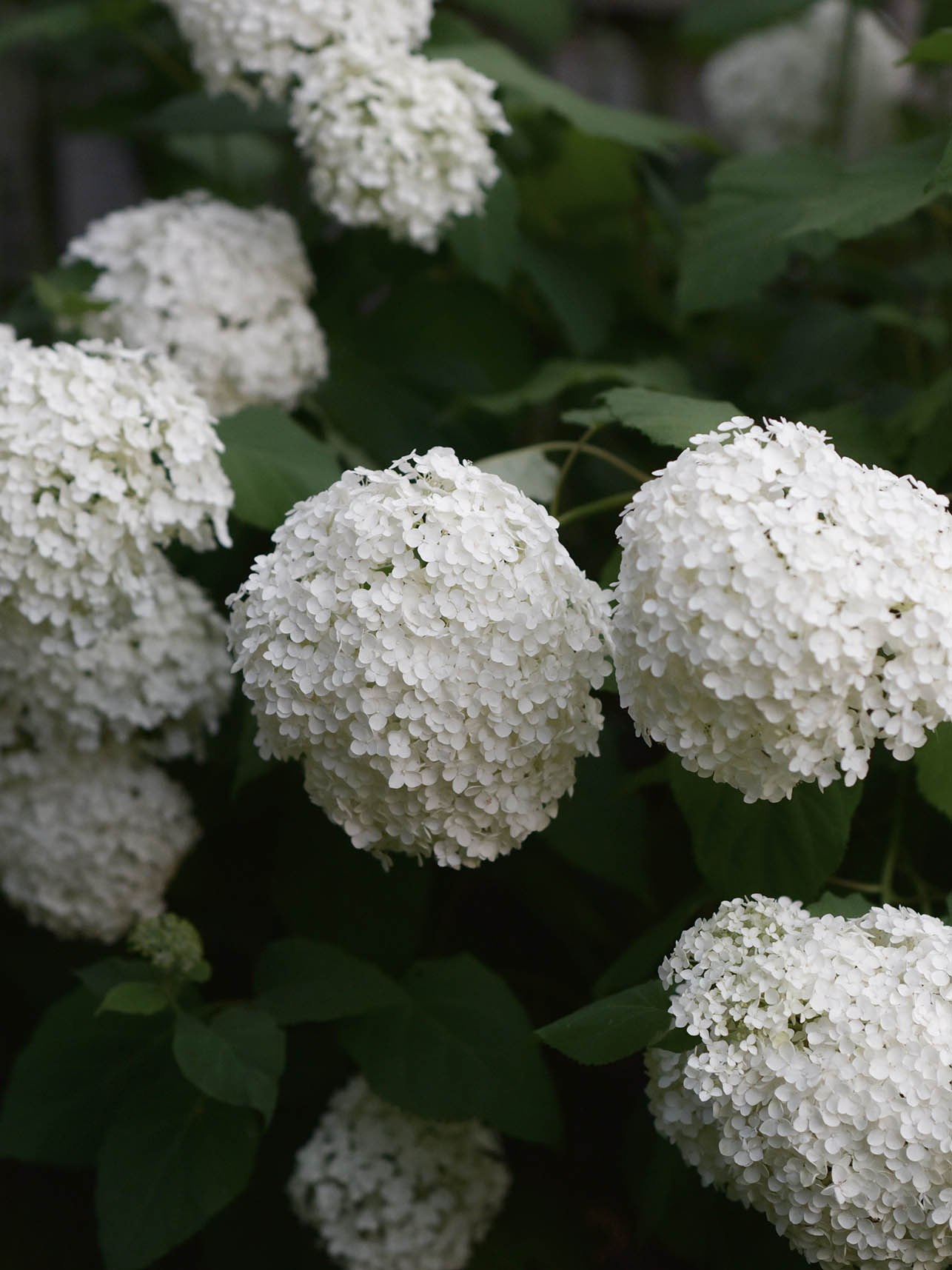 Blommor: Blommar på årsskotten med vita, stora, bollformade blommor som i knoppstadiet är limegröna. Långvarig blomning från juli till september. Klipp gärna bort de bruna blomställningarna på senhösten. Vänta med beskärning till våren.
