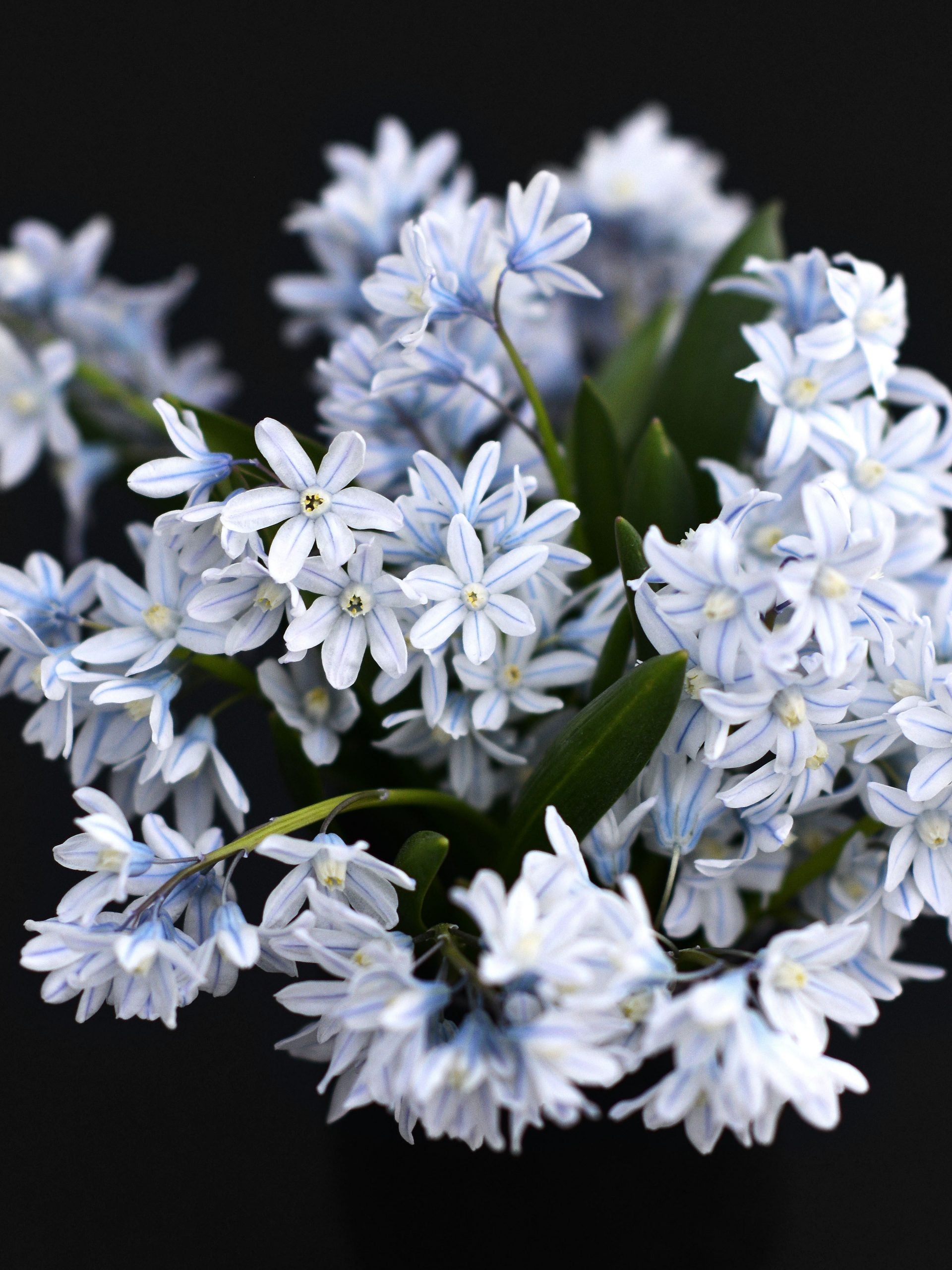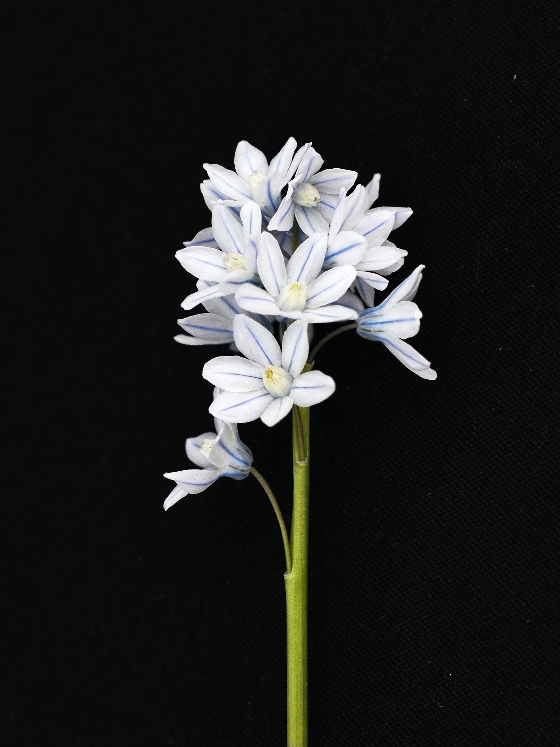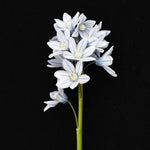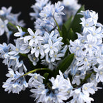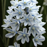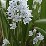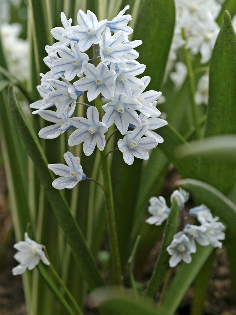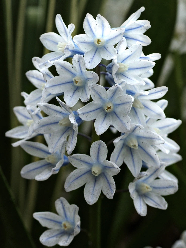 En liten förtjusande porslinshyacint som är vit med ljusblå ränder. På håll kan den se ljusblå ut och när du kommer närmare ser du ränderna. Växer snabbt ut i stora mattor. Lämplig i gles ängsmark. Blir cirka 10 cm hög och blommar i april.