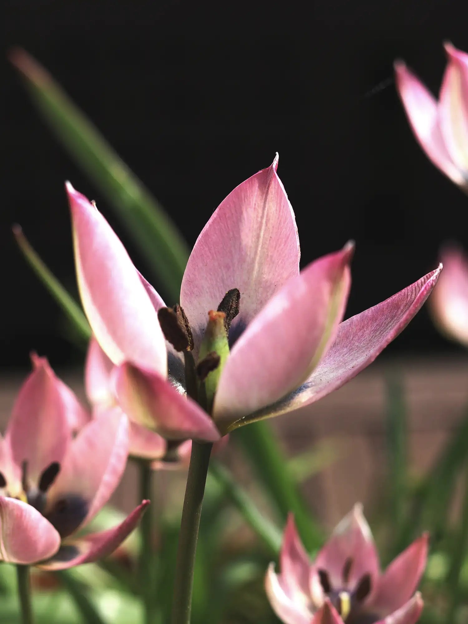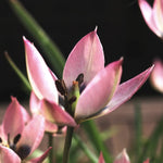 Tulpan 'Danique', Tulipa 'Danique' är en clusiana-sort med mjukt rosa kronblad som bleknar mot vit spets och en elegant kontrasterande mörk mitt. En charmig och nätt botanisk tulpan som ger ett romantiskt och stilfullt uttryck i både rabatt och kruka.