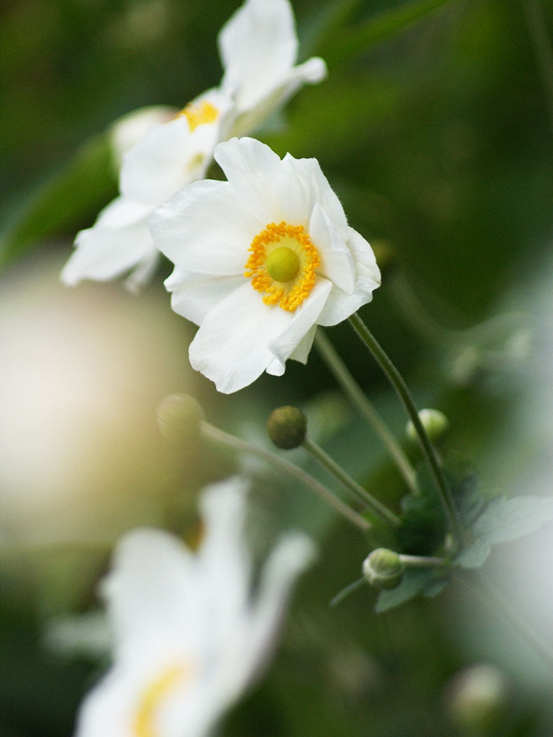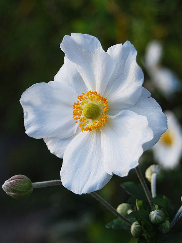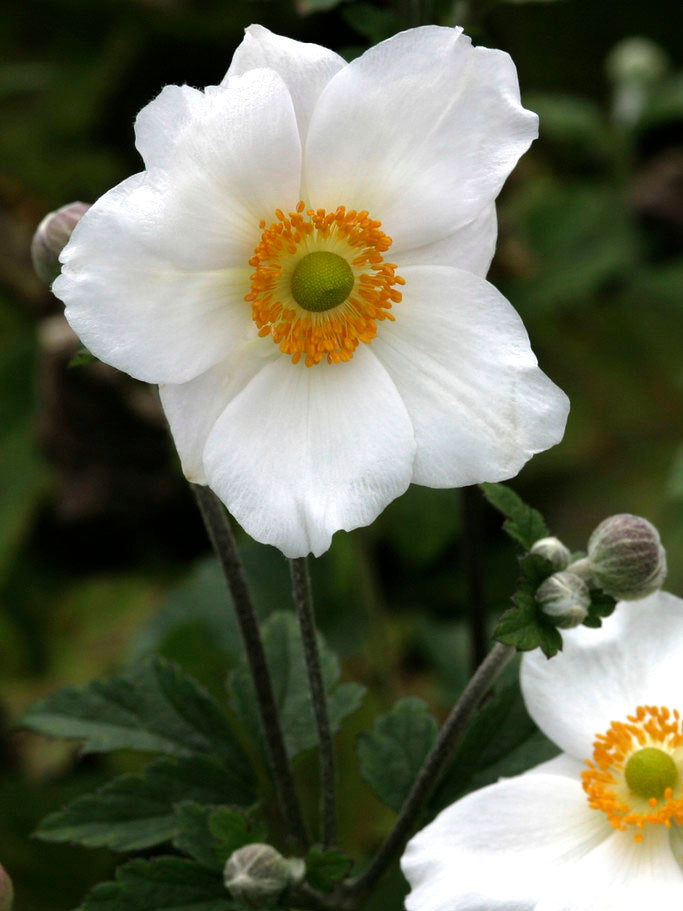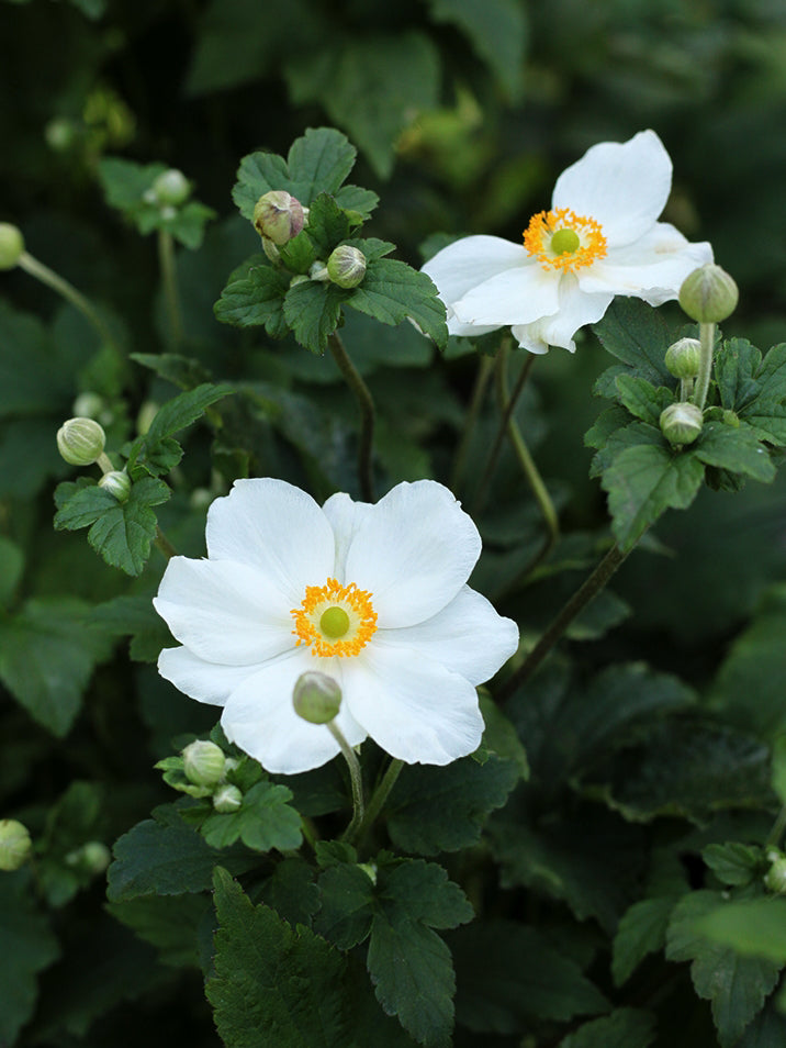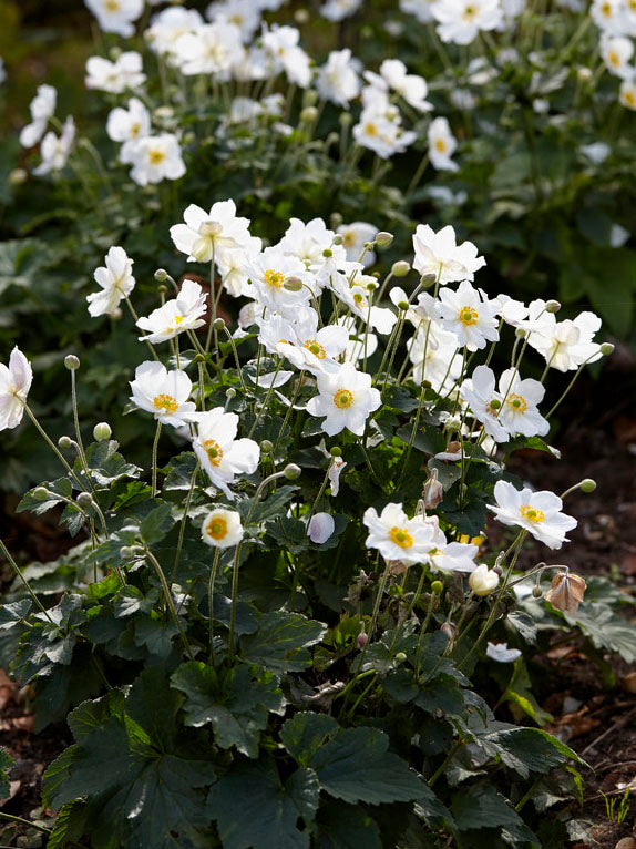 Mörkgröna handflikiga blad. Fylligt och vackert bladverk. Stora enkla vita blommor med gul ståndarkrans i mitten. Trivs i mull- och näringsrik, fukthållande men väldränerad jord. Ogillar vinterfukt. Vintertäckning med torra luftiga löv och granris. Kanske den vackraste höstanemonen av dem alla.