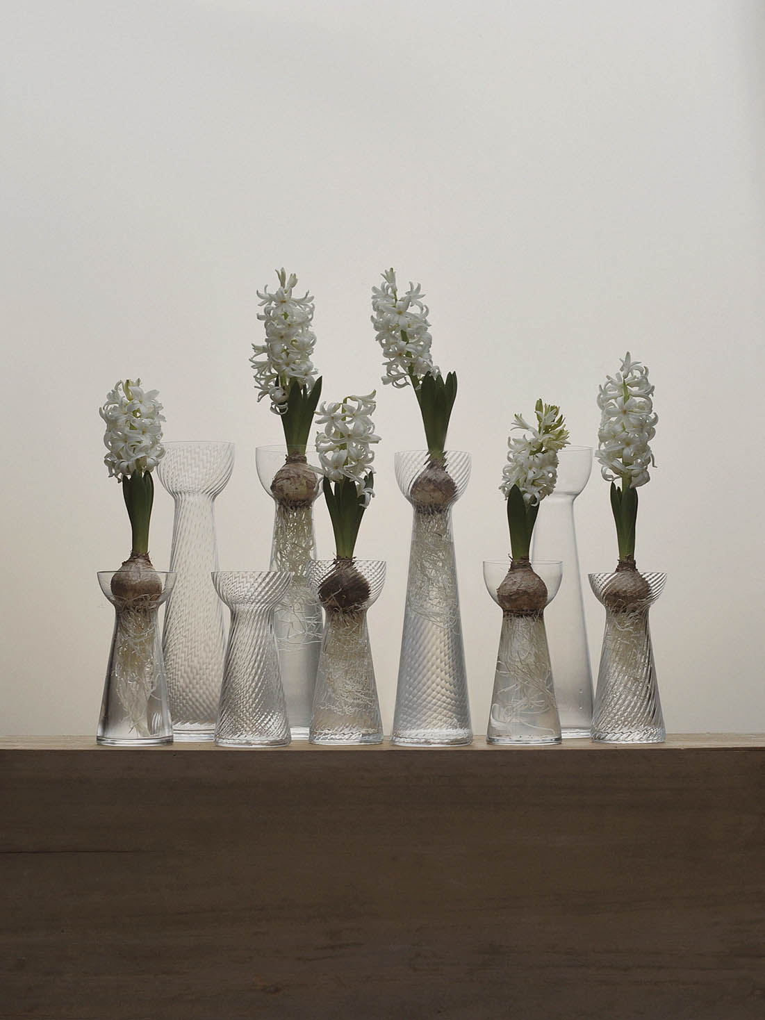 Hyacintvas ’Iden’ har en hög och enkel klassisk form, perfekt för att driva fram hyacinter. Den har en kupa som omfamnar löken och en större nederdel till rötterna. Gjord i kristallklart glas. Den har en tidlös design och glasvasen passar fint för en hyacint, stickling eller snittblommor.