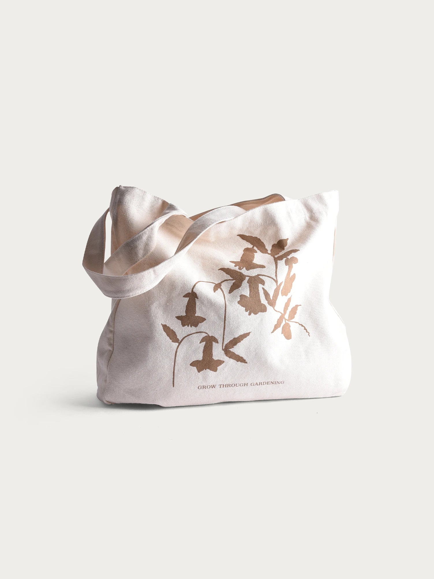En rymlig och slitstark tygkasse i bomullscanvas, prydd med ett unikt tryck av den vackra klockrankan (Cobaea scandens), en favorit som Victoria planterar i sitt växthus varje år.