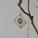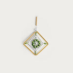 Glasdekoration 'Trädgårdsfönster' har en mjuk geometrisk form i grön och bärnstensfärgat glas. Ljuset speglas vackert och skapar ett levande skimmer som framhäver hantverket och de rena linjerna.