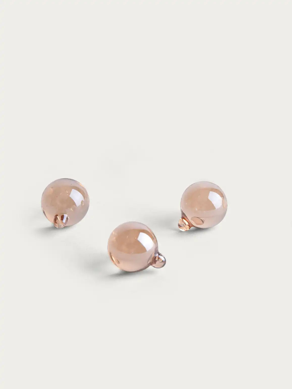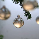Glaskulor 'Gold Champagne' i massivt champagnefärgat, handgjort glas med upphängningshål. Får en lätt vacker metallisk reflektion i vissa ljus. En enkel och stilren dekoration för alla säsonger. Passar lika bra i julgranen och fönster som över ett dukat bord. Ljuset speglas vackert i det genomskinliga glaset.