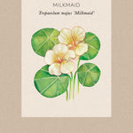 Slingerkrasse ’Milkmaid’ blommar i en krämvit färg som nästan blir självlysande på kvällen. Har ett något mer buskigare och kompakt växtsätt, vilket gör att den passar i kruka eller ampel. Blommorna har en pepprig smak som är perfekt i sallader. Lätt att odla. Älskas av bin och fjärilar! Kan med fördel sås direkt på växtplatsen. Tropaeolum minus 'Milkmaid' på latin.