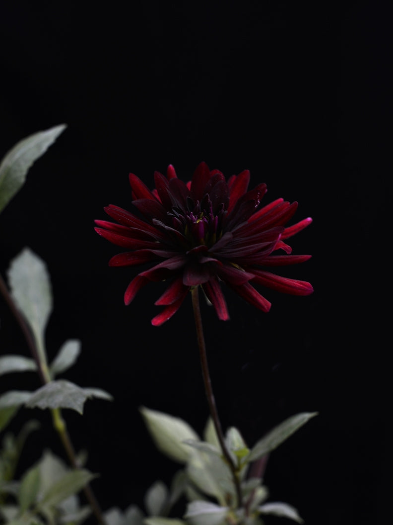En överdådig kaktusdahlia i en djupt röd färgton som nästan skiftar i svart. Mångas favorit i den sena sommarens planteringar. Gör sig bra som snittblomma.