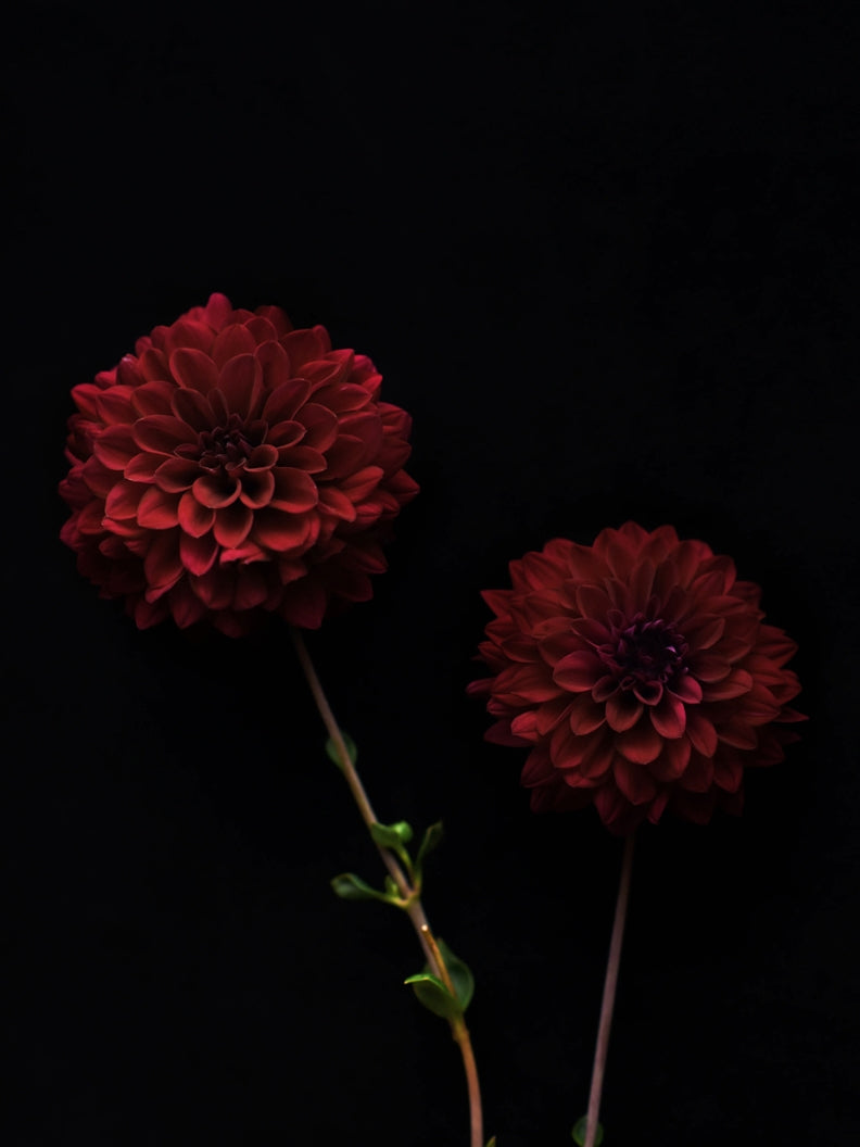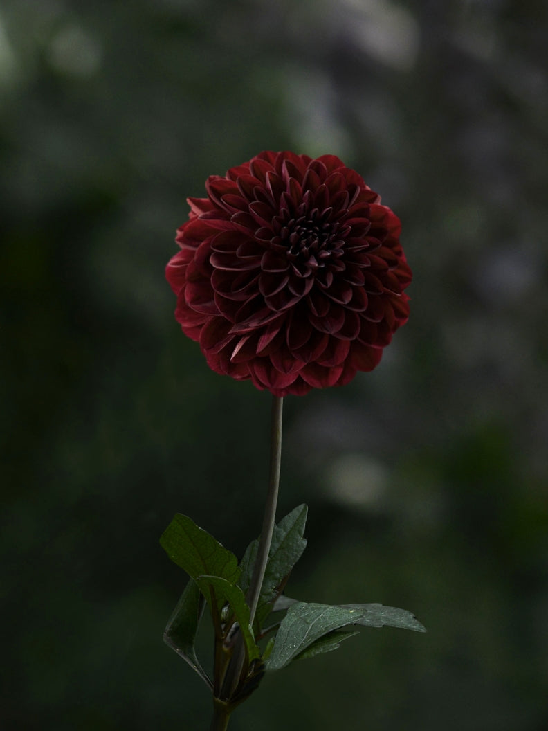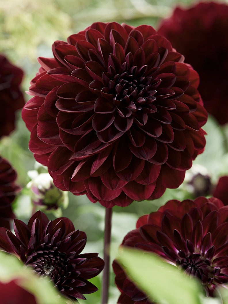 Dahlia ’Dark Spirit’ är en dekorativ mörkt röd, nästan svart bolldahlia. Utsökt i rabatten och i frodiga sensommarbuketter!