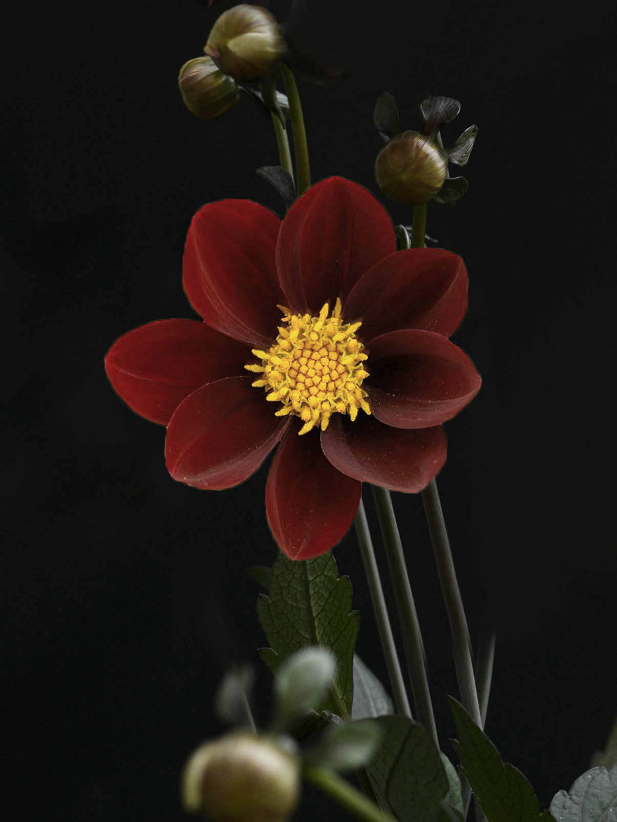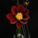 Dahlia ’Mexican Star’ har dramatiskt mörkt rödbruna blommor med intensivt gul mitt. Den är en hybrid med Cosmos atrosanguineus chokladskära och har fått med sig färgen och en lätt doft av kakao. Blomkorgarna är enkla och nätta, bara 6 cm stora. Även stjälkar och bladverk är mörka. Effektfulla att blanda i finaste planteringen såväl som i buketter. Ger även mat till humlor, bin och fjärilar.