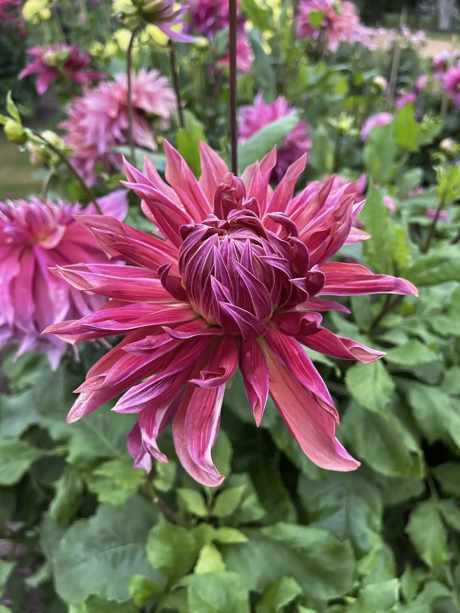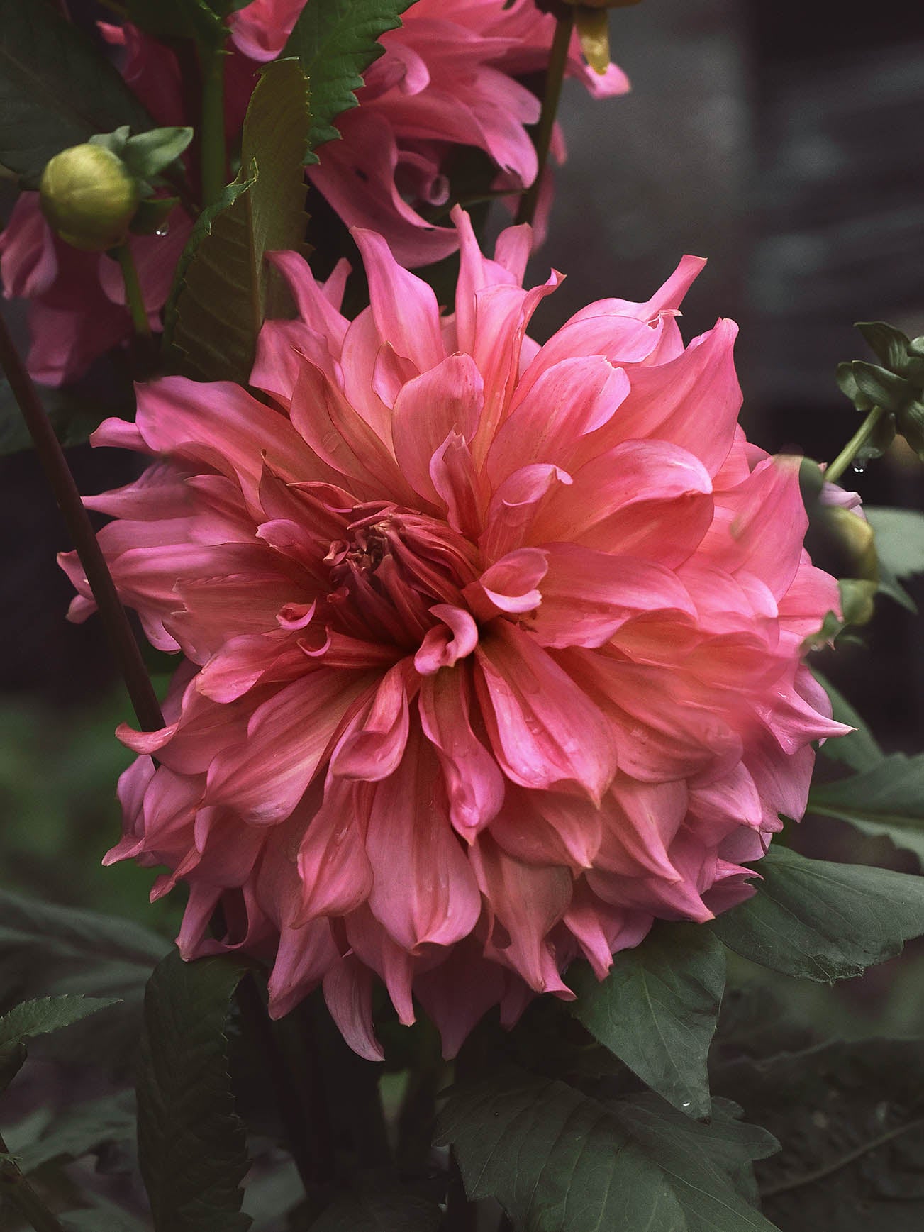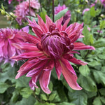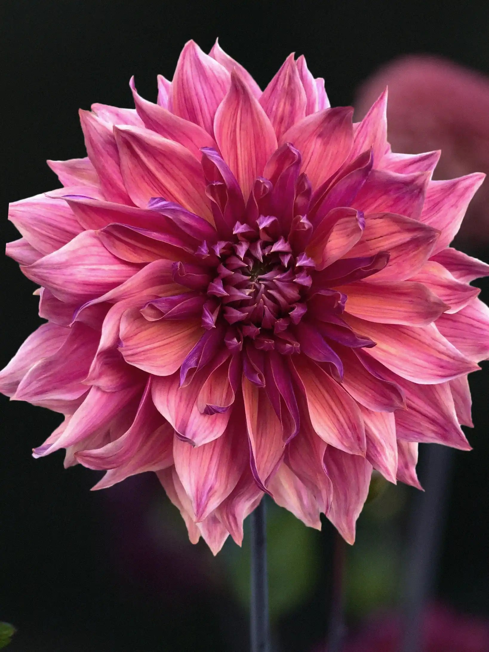 Dahlia ´Penhill Dark Monarch´ är en magnifik dahlia i en spännande färg. Blommorna blir stora, 25 centimeter i diameter vilket gör den iögonfallande såväl i trädgård som bukett. De elipsformade kronbladen ger intryck av att vara penselmålade i hallon- och plommonfärgade nyanser på aprikos botten. Det är en oemotståndlig dahlia med ett färgstarkt och livfullt utseende.