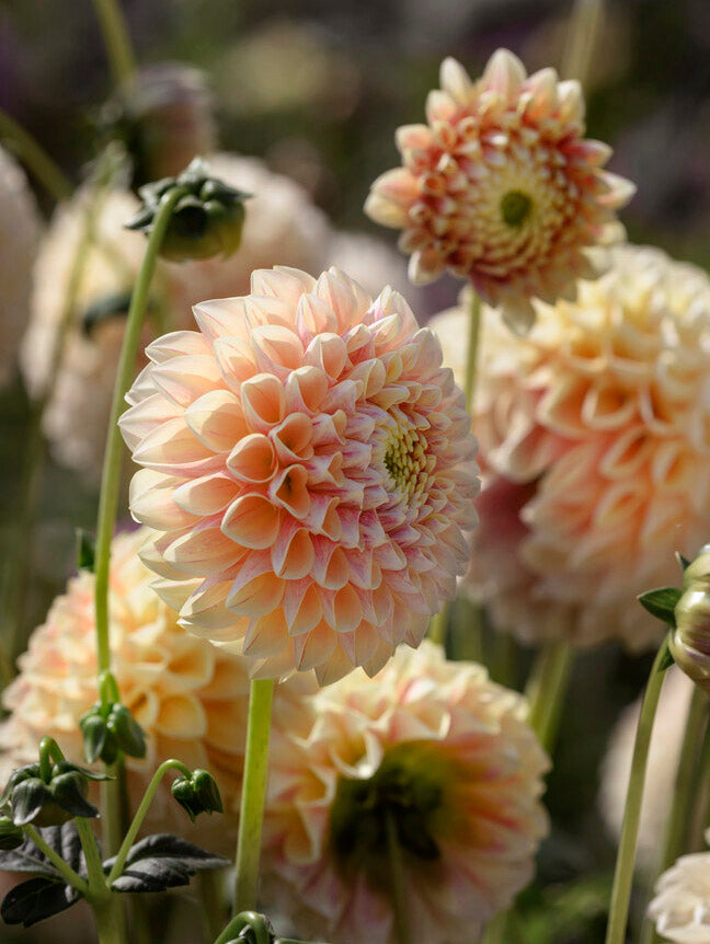 Dahlia ’Sweet Suzanne’ är en så kallad bolldahlia vars fyllda runda blommor kan bli upp 10 centimeter. Det här är en utmärkta snittblomma som får aprikosfärgade blommor med kronblad som har blyertstunna streck i en något mörkare ton vilka möts i en glad, citrongul mittpunkt. Kronbladens toppar är något flikiga vilket gör blomman livfullt söt. Det är en ljuvlig dahlia som kickar igång lusten att skapa sköna blandbuketter vackra färgskalor.