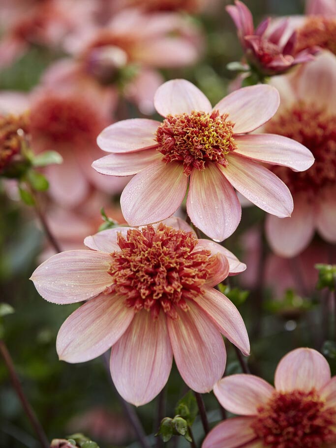 Dahlia ’Totally Tangerine’ är med sitt busiga utseende och sina solig, syrliga citrustoner en riktig glädjespridare. Sorten är anemonblommande med stora, korallrosa kronblad runt en rufsig mitt av intensivt orangea småblommor. Stjälkarna är mörka och bladen dovt olivfärgade. I buketter ger blommorna en härligt bohemian chic-känsla och är lika fina att blanda med ljusa som mörka nyanser. Omtyckt av humlor, bin och fjärilar.