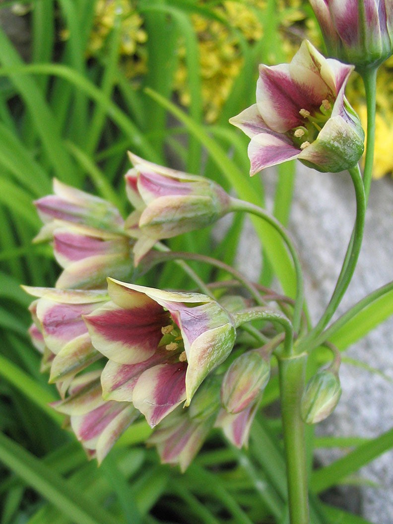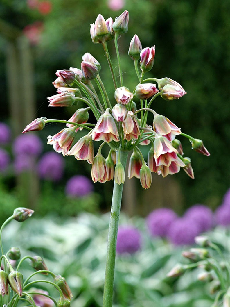 Honungslök har kraftiga stänglar med 10-30 hängande klocklika blommor i blekrosa till violett färg i juli. Svag doft. Trots hängande blomma så vänder frökapseln uppåt. Höjd 60-70 cm. Lättodlad och mångårig lökväxt. Planteringsdjup 3 ggr lökens storlek. Kombinera med prydnadsgräs, stjärnflocka och rödbladig kärleksört.