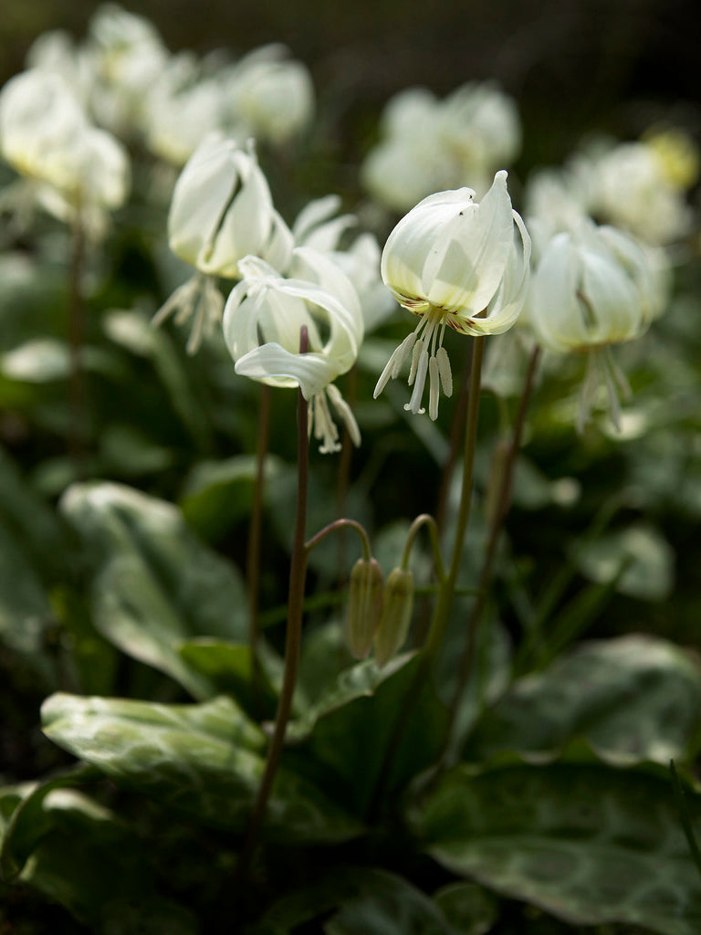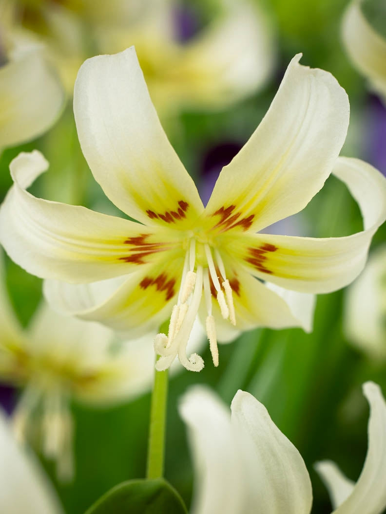 Hundtandslilja ‘White Beauty’, med rena vita blommor med gula och bruna inslag, är en klassisk hundtandslilja för rabatten och en av de mest lättodlade sorterna. Blommar tidigt på våren och blir 20-25 cm hög.