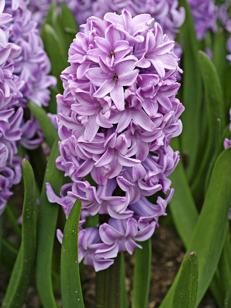 Hyacinter ska planteras tidigt på hösten i ett soligt läge med väldränerad och lätt fuktig jord ca 15 cm under jorden. Under växtsäsongen håll jorden jämnt fuktig.
