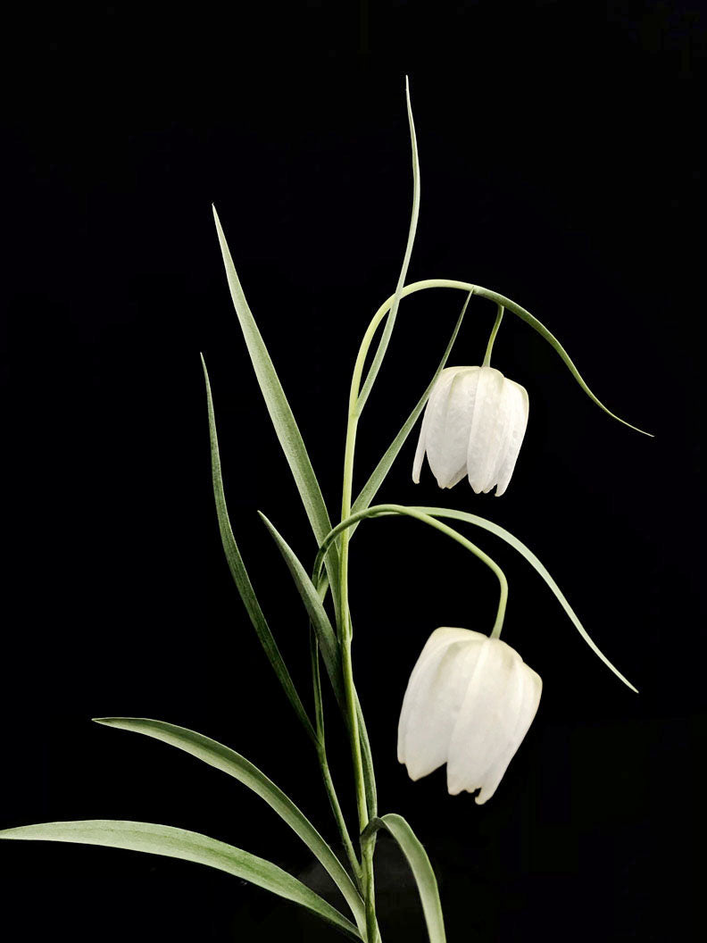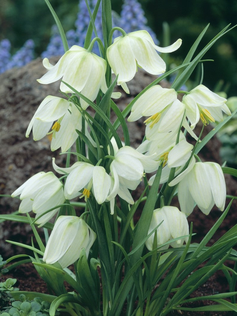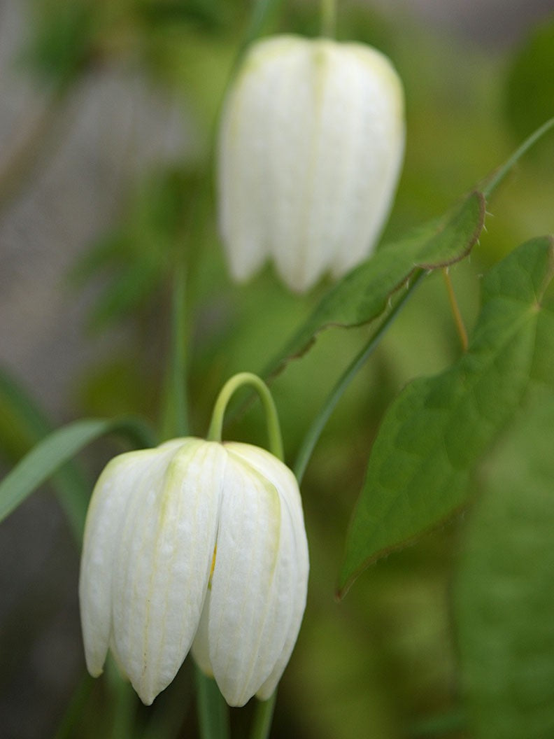 Kungsängslilja ’Alba’ Fritillaria meleagris ’Alba’. Vita hängande klockor i toppen på tunna stjälkar. Lökväxt med smala grågröna blad.