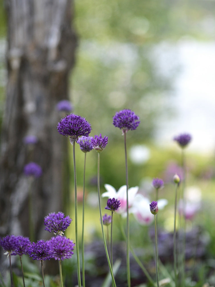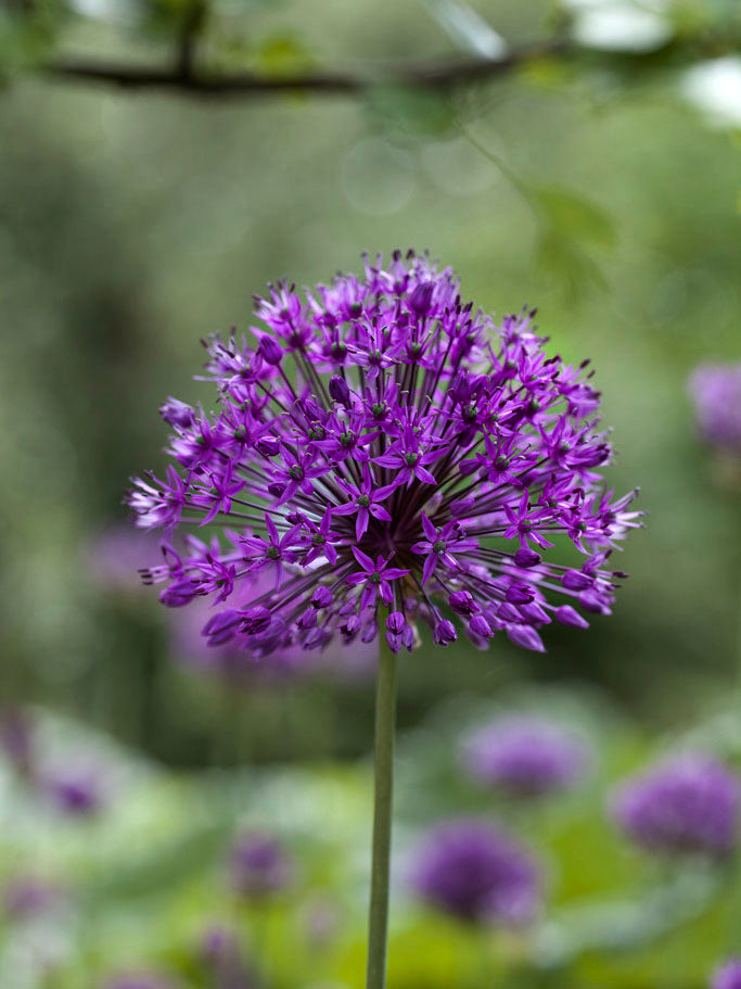 De bollformade lilaröda blommorna sitter på stadiga stjälkar och blommar i juni. Bladverket kommer tidigare och vissnar ner innan blomman slår ut. De kan med fördel planteras i en matta av perenner tex alunrot, funkia och ormbunkar som döljer det vissnande bladverket.