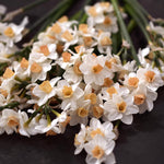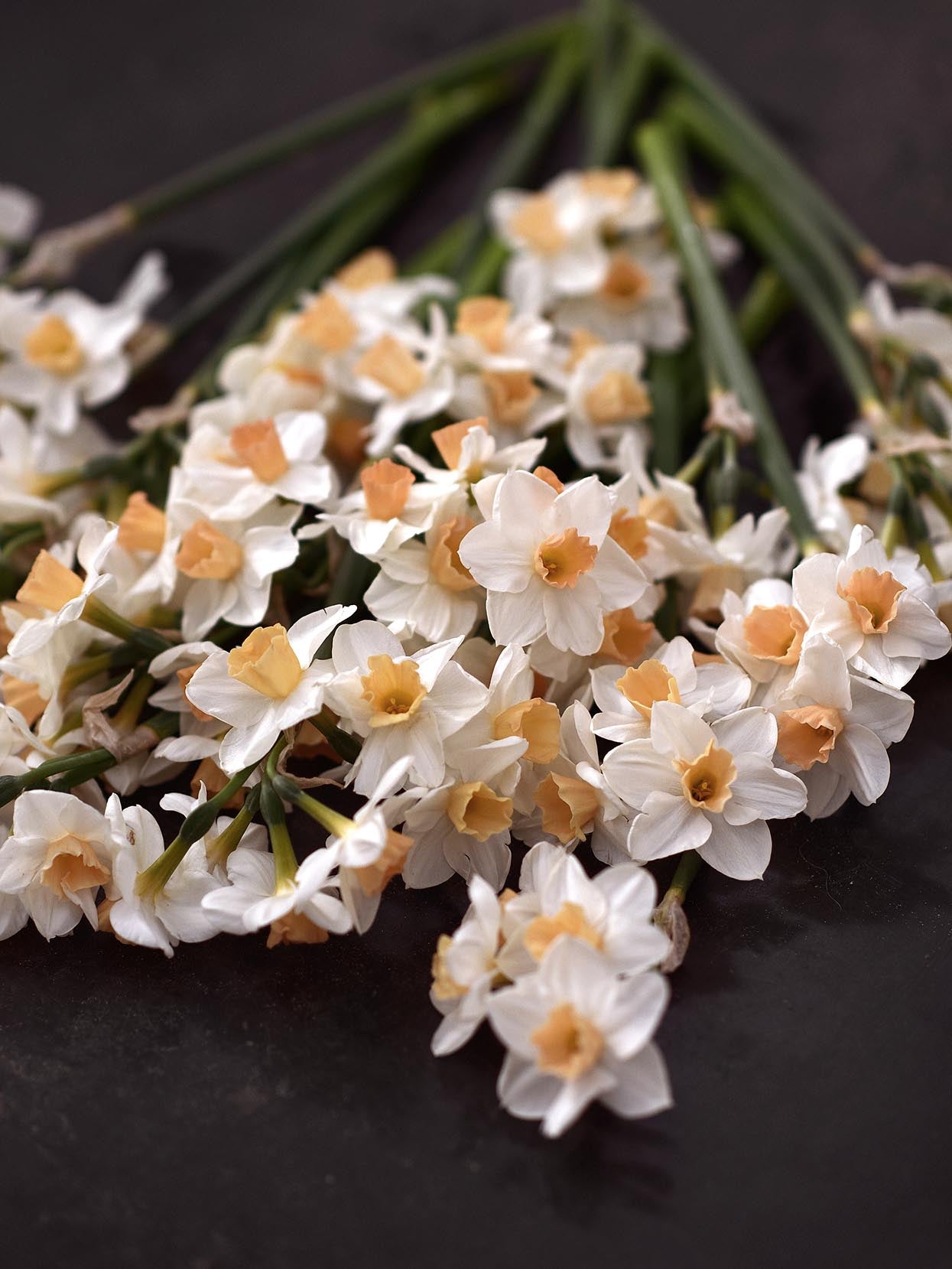 Narciss, trädgårdstazett 'Kapiti Peach', Narcissus (Tazetta-Gruppen) 'Kapiti Peach'. En mångblommig narciss med vita kronblad och aprikos krona med stark doft. Rådjurssäker.
