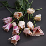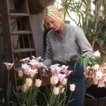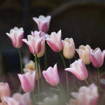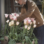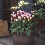 Tulpanmix ’Pink Champagne’ innehåller tulpanen ’Sanne’ som är en liljeblommande och väldoftande tulpan som bjuder på olika skiftningar under sin blomningstid. Den börjar i en svagt rosa färg för att sedan bli aprikos och därefter blekna till en krämfärgad ton. Den blev mycket vacker ihop med ’Apricot Beauty’ som vi valde att samplantera den med i våra stora ekfat vid butiken. Tulpanen ’Apricot Beauty’ är en ståtlig sort, som är en korsning av darwin och triumftulpan. Skiftar i olika rosa toner med nyans av aprikos.