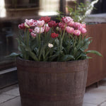 Plantera dem gärna i rabatten eller i ett större kärl som rymmer minst 40 liter så att proportionerna med de höga stjälkarna kommer till sin rätt. Tulpanen ’Peptalk’ bjuder på olika färgintensiteter som cremerosa till smultronrött med olika streckningar i kronbladen. Otroligt fina tillsammans med ’Pink Star’. Det här är vår mest fotograferade komposition, som fick all uppmärksamhet när den blommade i våras på årstidstorget. Även mycket hållbara som snitt.