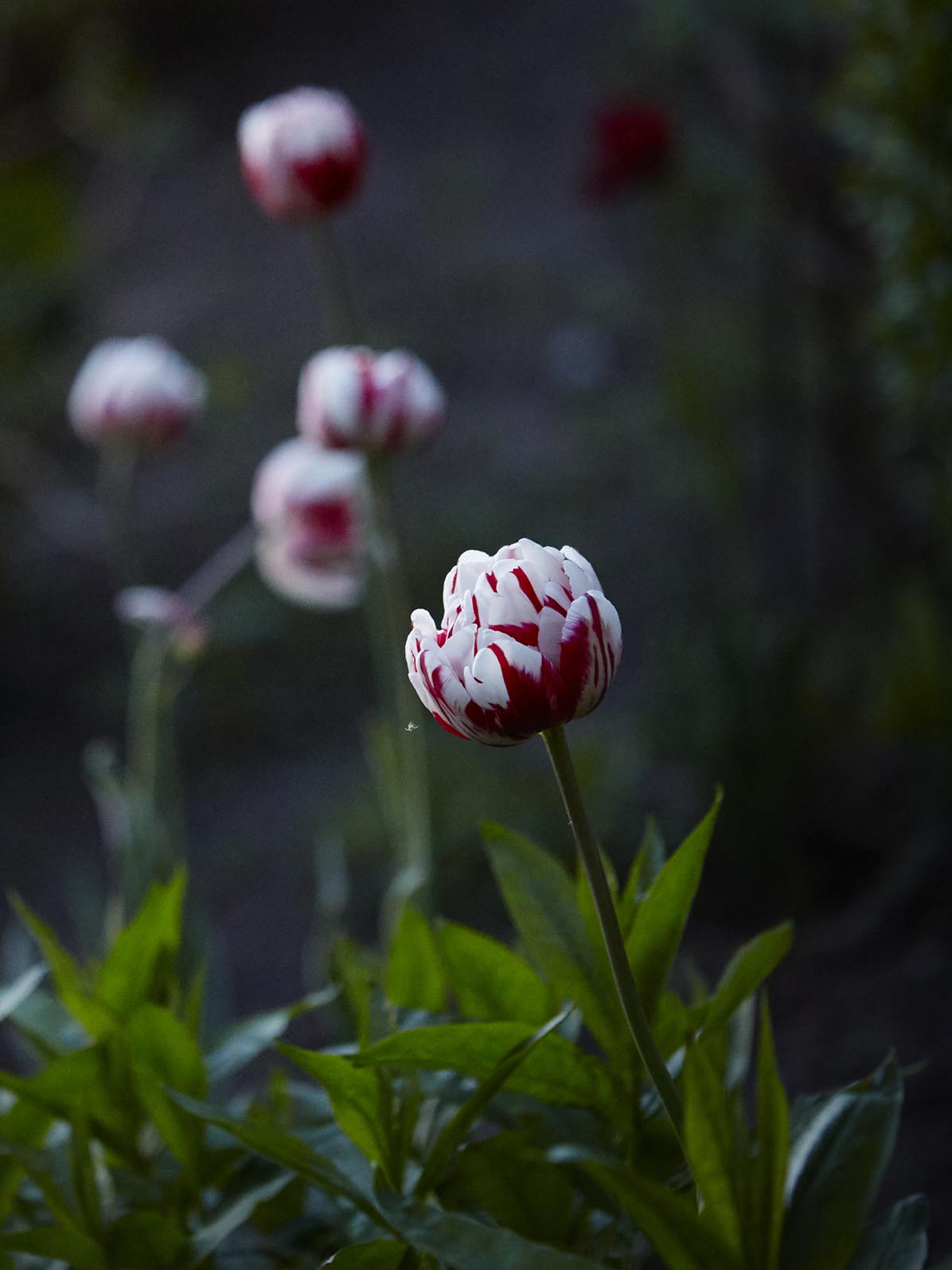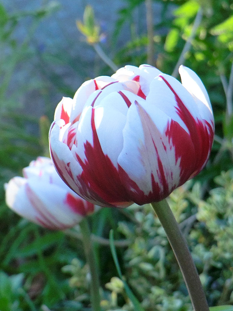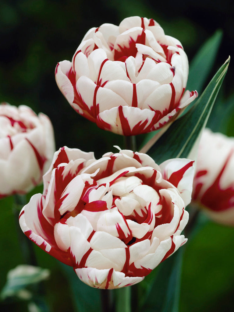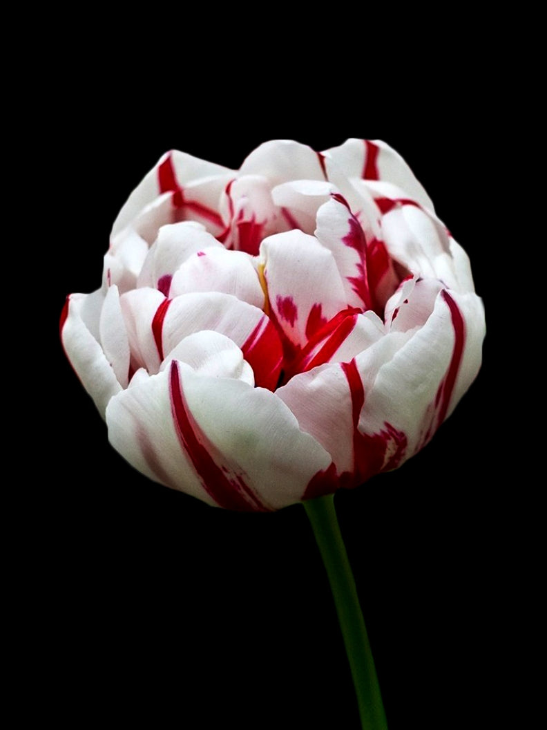 Tulpan ’Carnaval de Nice’. En fylld vit tulpan med färgsprakande röda strimmor och inslag av gula toner. Tillhör den Sena Fylldblommiga Gruppen.