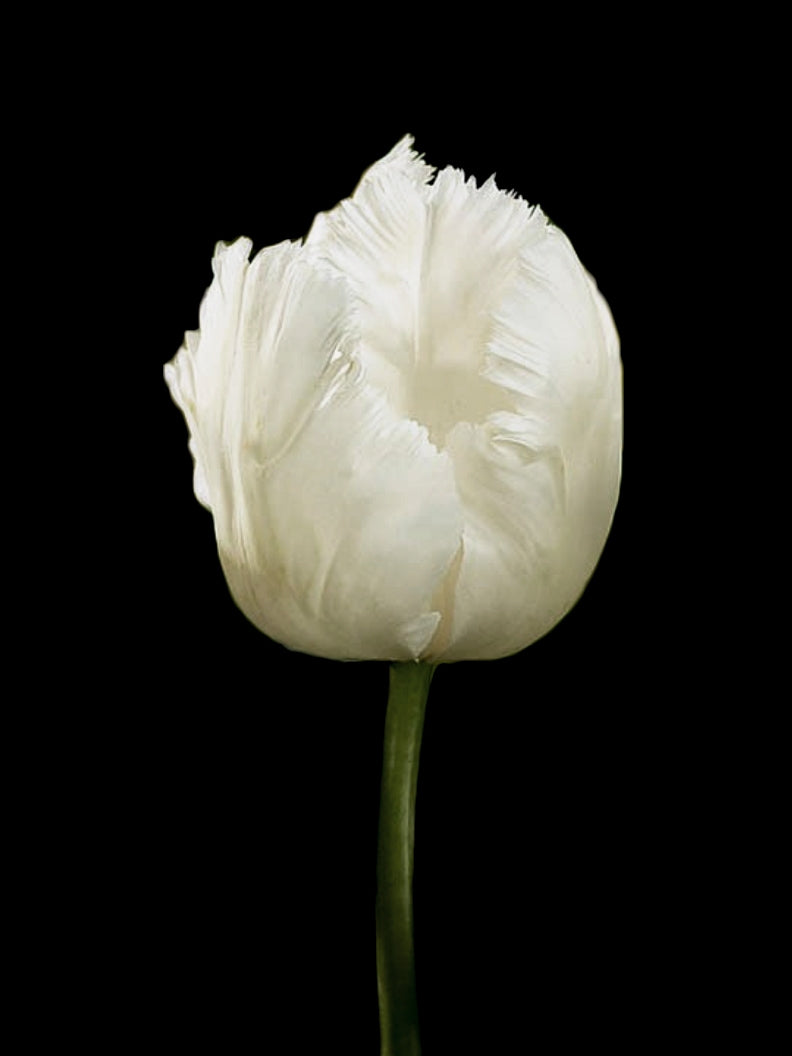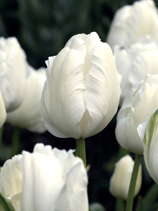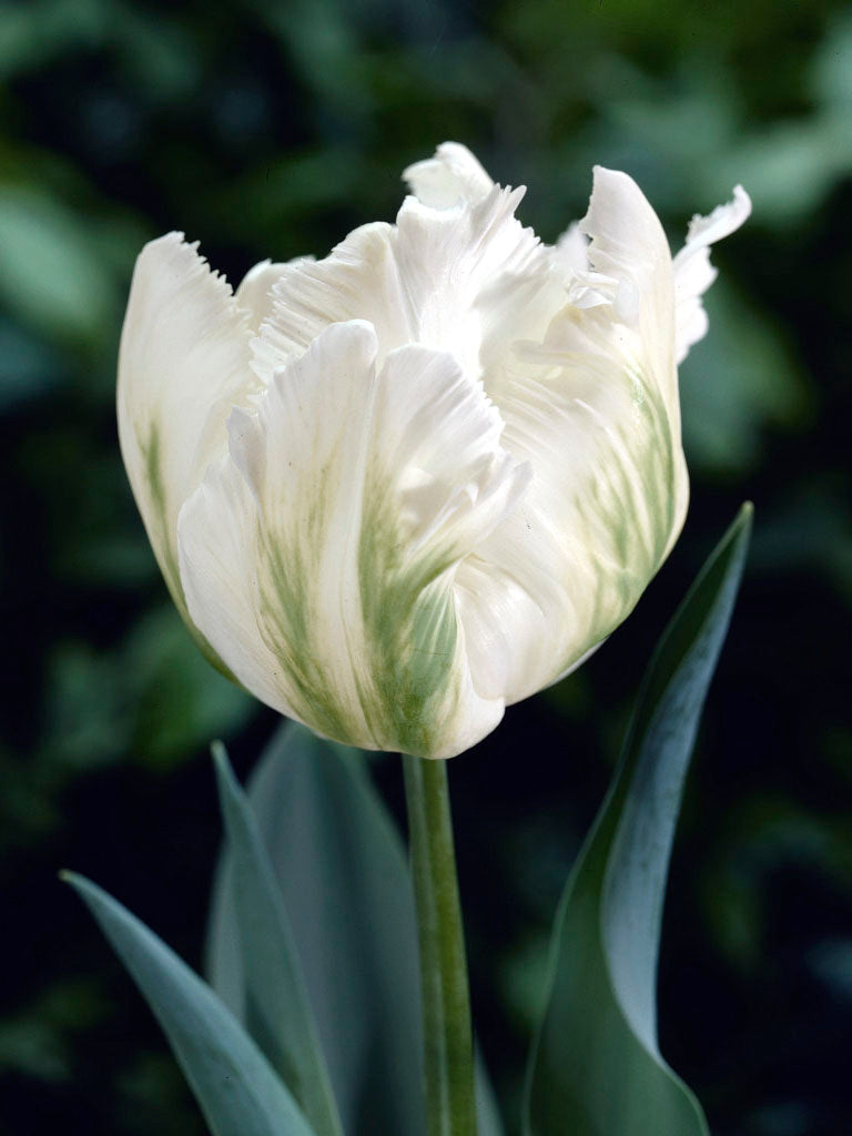 Denna papegojtulpan utgör med sina snövita och stora kronblad en uppfriskande syn i varje rabatt. När bladöppningen är som vidast kan tulpanen nästan få ett platt utseende. Blommar sent om våren, en bit in i maj. Blir uppemot 50 cm hög.